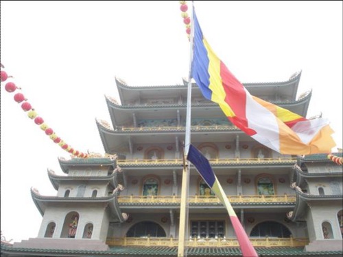 Phật kỳ tung bay trước chính điện chùa Vạn Đức