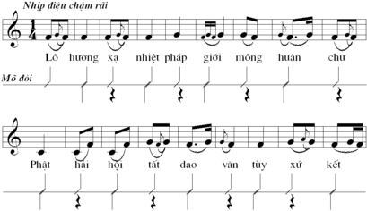 Điểm đáng chú ý, tuyến giai điệu tụng kinh đi liền mạch, không phân theo câu. Trong đó, người tụng có thể tùy ý phân ngắt ở điểm bất kỳ trong bài kinh để lấy hơi trên nền mõ trì tục. Nếu tụng kinh dùng một mõ đệm gọi là nhịp mõ một.
