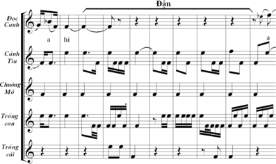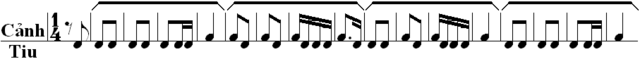 Cụ thể, người bên này cầm trống con thì người đối diện bên kia phải cầm tiu cảnh. Người bên này cầm trống cái thì người bên kia phải cầm não bạt. Trong diễn xướng phần Kệ- Canh, mỗi bên tả hữu vừa đồng ca tán Canh vừa đua chen các chùm tiết tấu đan xen phụ họa, nâng đỡ giai điệu. Dưới đây là mô hình tiết tấu cơ bản của bộ nhạc cụ tiu cảnh đệm cho giọng Canh.