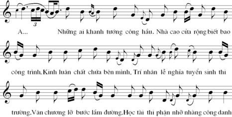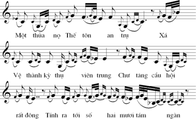 Ví dụ, để “hát” những bài kinh, người ta sử dụng một lối giọng chuyên dùng gọi là Tụng. Và, động từ tụng cũng chính là để chỉ việc diễn xướng lối giọng này- tụng chứ không hát. Động từ tấu hay thỉnh đồng thời để chỉ hai loại giọng Tấu, giọng Thỉnh. Giọng Kệ thì dùng động từ đọc. Riêng với giọng Thán thì có thể dùng thẳng động từ thán hay cũng gọi là đọc Thán. Còn với giọng Chú thì gọi là tụng Chú hay niệm Chú.