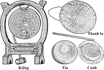 Bên cạnh đó là các loại tiu, cảnh, thanh la, kiểng, não bạt. Trong đó, dễ nhận thấy cảnh và thanh la cũng là những nhạc cụ được sử dụng trong hát Chầu Văn. Độc đáo nhất phải kể đến cái kiểng, cấu tạo dạng đĩa đồng hình tròn đường kính chừng 20-25cm, một mặt nhẵn phẳng, một mặt có vành chỉ bao quanh, giữa có núm lồi nhỏ, các nghệ nhân gọi là “tay mặt”.