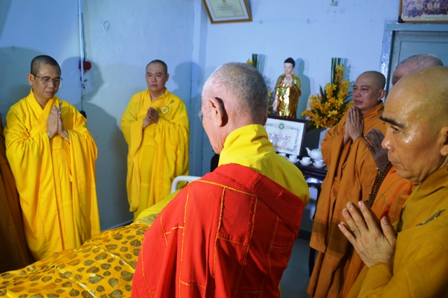 TT.Thích Thiện Tấn, Phó Trưởng ban Trị sự GHPGVN tỉnh Khánh Hòa trú trì chùa Bửu Phước, Trưởng tử thay mặt môn đồ pháp quyến tác bạch cung thỉnh; HT.Thích Minh Châu, Ủy viên HĐTS, Phó Trưởng Ban Nghi lễ Trung Ương GHPGVN, Phó Trưởng Ban Trị sự GHPGVN tỉnh, Trưởng Ban Nghi lễ Phật giáo Khánh Hòa sám chủ đã cử hành nghi thức trị quan truyền thống thiền môn, sau đó cung thỉnh nhục thân Trưởng lão Hòa thượng tân viên tịch nhập kim quan. Toàn thể chư tôn đức giáo phẩm, Tăng Ni và Phật tử đã đồng thanh niệm Phật hòa cùng tiếng chuông trống Bát-nhã trầm hùng khi nhục thân của ngài được chư Tăng cung thỉnh rời thiền thất nơi ngài tịnh dưỡng đến lễ đường Tổ đính Nghĩa Phương, nơi tôn trí kim quan của Trưởng lão Hòa thượng Phó Pháp chủ tân viên tịch.