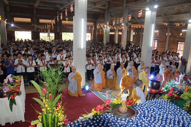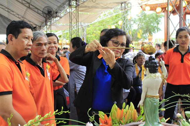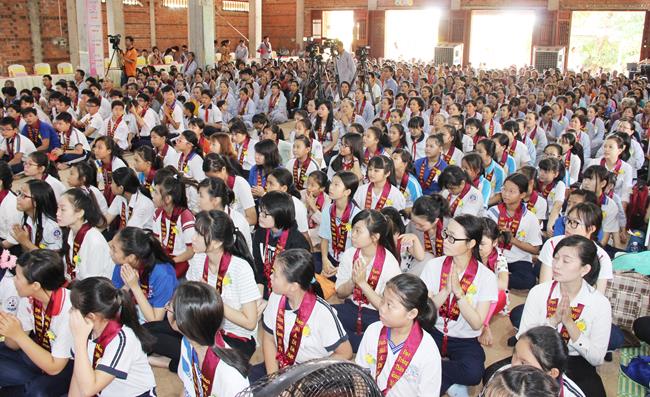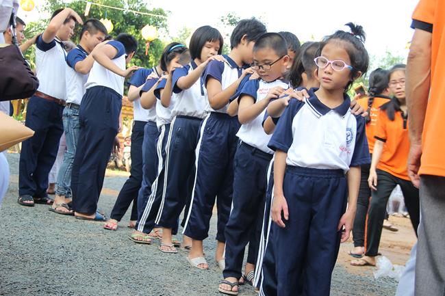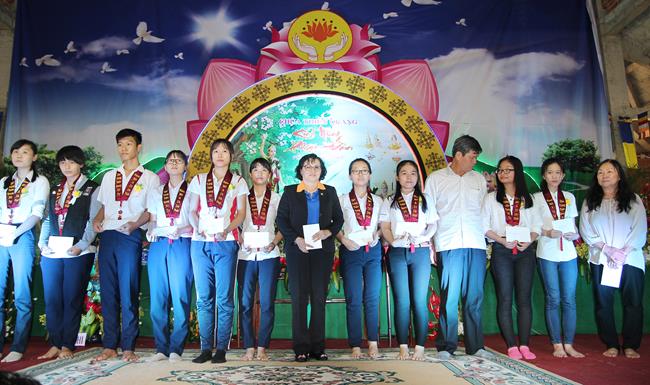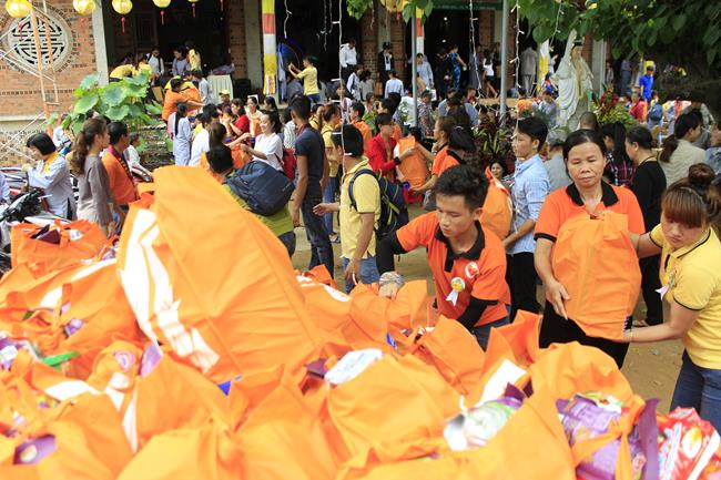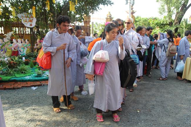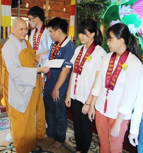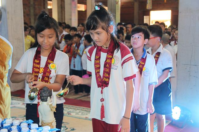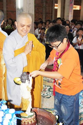 Các bạn sinh viên và học sinh cũng được tắm Phật ở khu vực dành riêng cho các bạn trẻ. 100 phần học bổng được trao tặng cho các bạn có hoàn cảnh khó khăn nhưng hiếu học. Có đến 500 phần quà (tịnh tài và tịnh vật) mang nặng tình nghĩa yêu thương được tặng cho những người khiếm thị. Tôi được biết việc làm cao quý của sư không chỉ hôm nay, mà chùa giúp người khuyết tật và khiếm thị thường xuyên theo các khóa tu định kỳ.