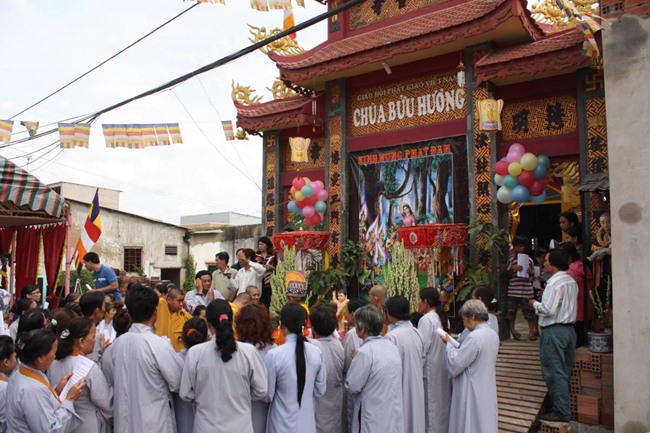 Ngay từ 8h sáng, toàn thể Phật tử đạo tràng chùa Bửu Hương đã vân tập về chùa, trang nghiêm chiêm ngưỡng khung cảnh lễ đài Phật đản tại chánh điện, với cờ hoa rực rỡ, như thể hiện tấm lòng thành kính của những người con Phật dâng lên kính mừng ngày Đản sinh của Đức Từ Phụ Thích Ca Mâu Ni.