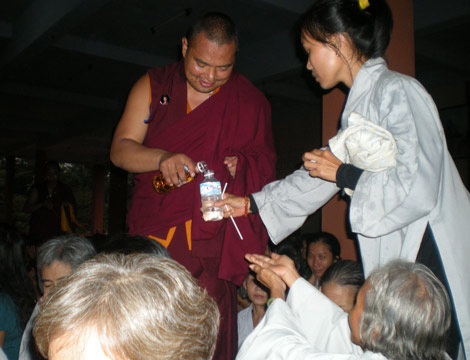 Giữa buổi lễ quán đảnh, Đức Pháp Vương Gyalwang Drukpa còn ban nước Cam Lồ của Bồ Tát Kim Cương Tát  Đỏa và của Đức Phật  A Di Đà và dây đeo hộ mạng.