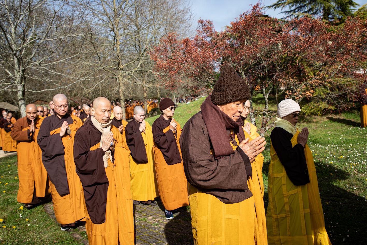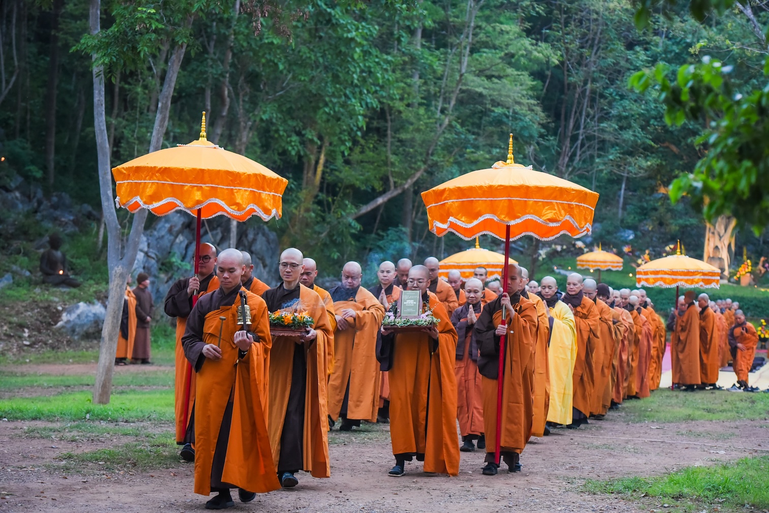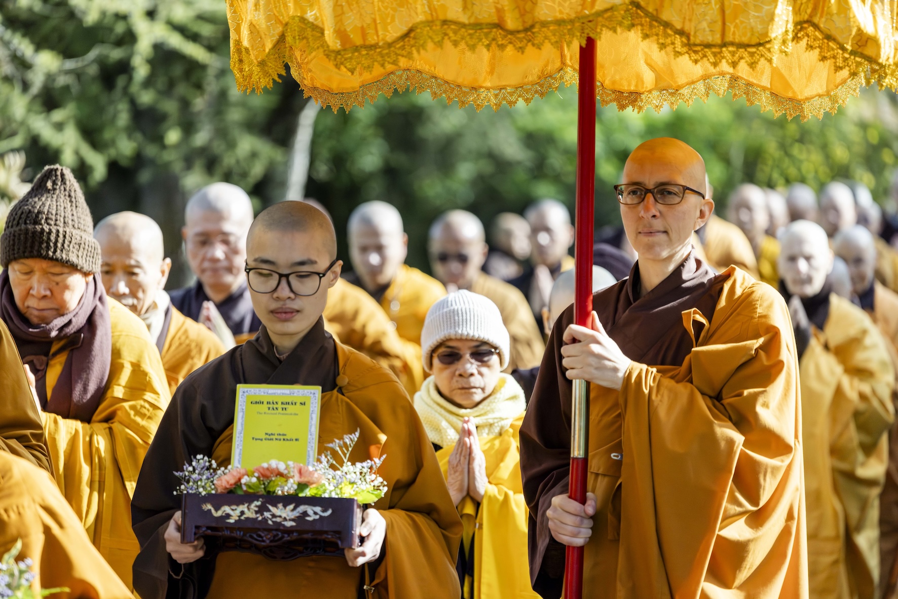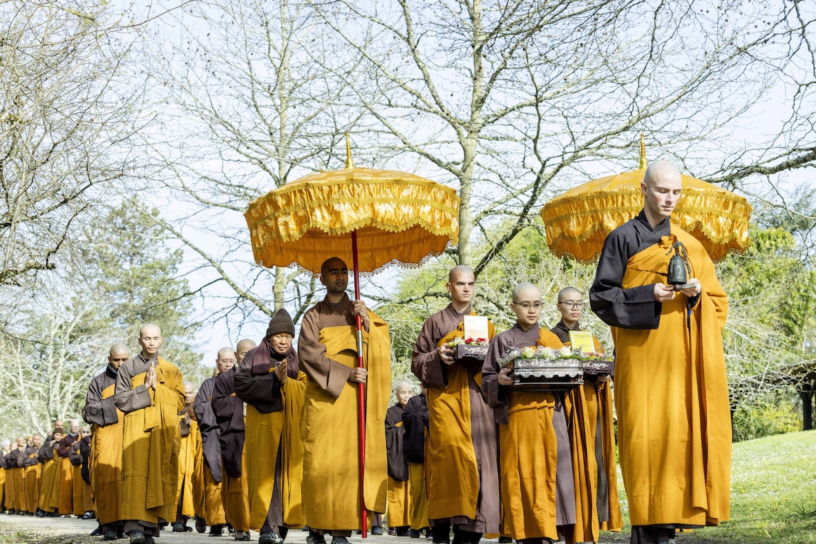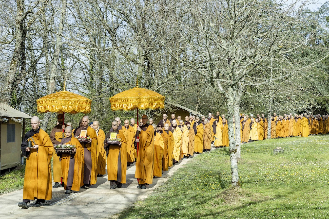 Trong không khí trang nghiêm và thanh tịnh, từng bước chân chậm rãi của các vị xuất sĩ trong y vàng rực rỡ hoà cùng tiếng chuông, tiếng trống bát nhã vang vọng khắp núi đồi xóm Thượng. Đất trời như rung động, hoan hỷ trước sự thành kính của các giới tử và đại chúng, những người một lòng cầu thỉnh giới pháp của Bụt – là ánh sáng soi đường cho sự thực tập, chuyển hoá và phụng sự.