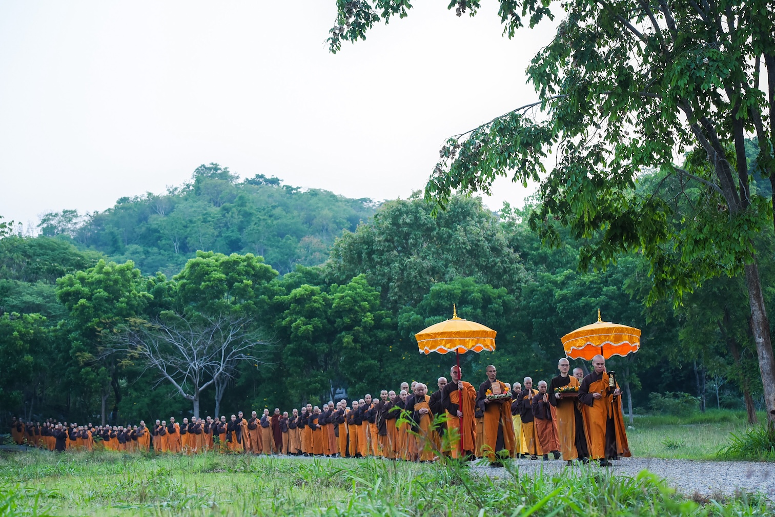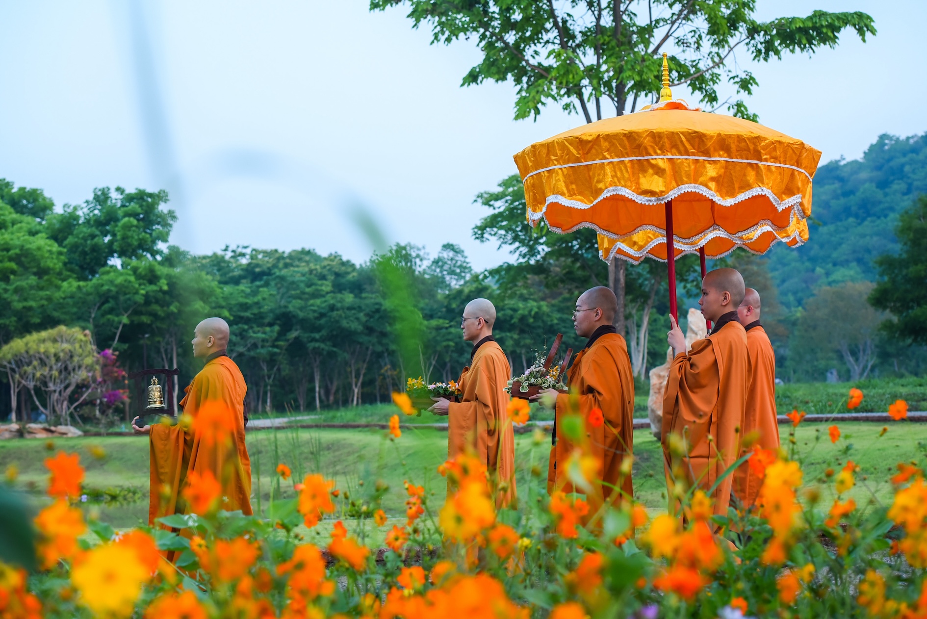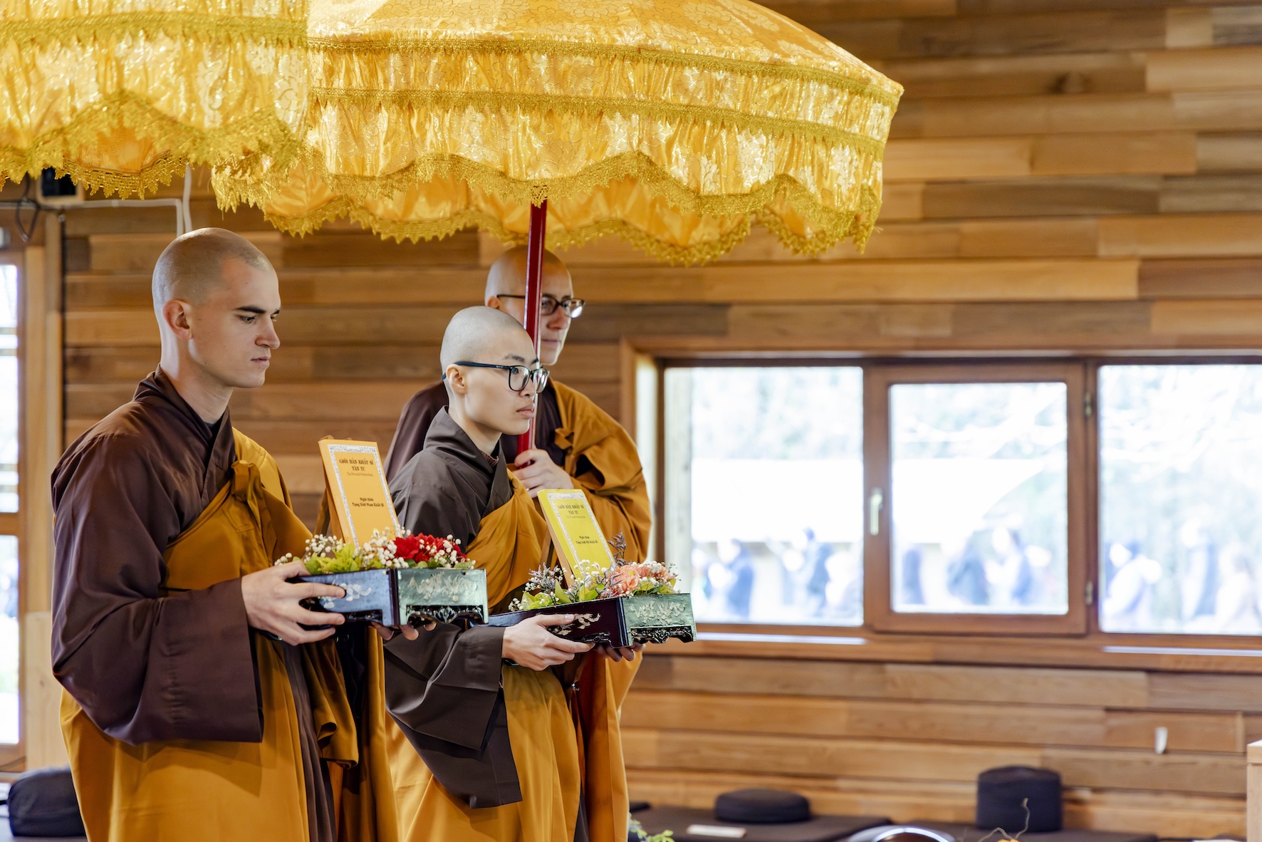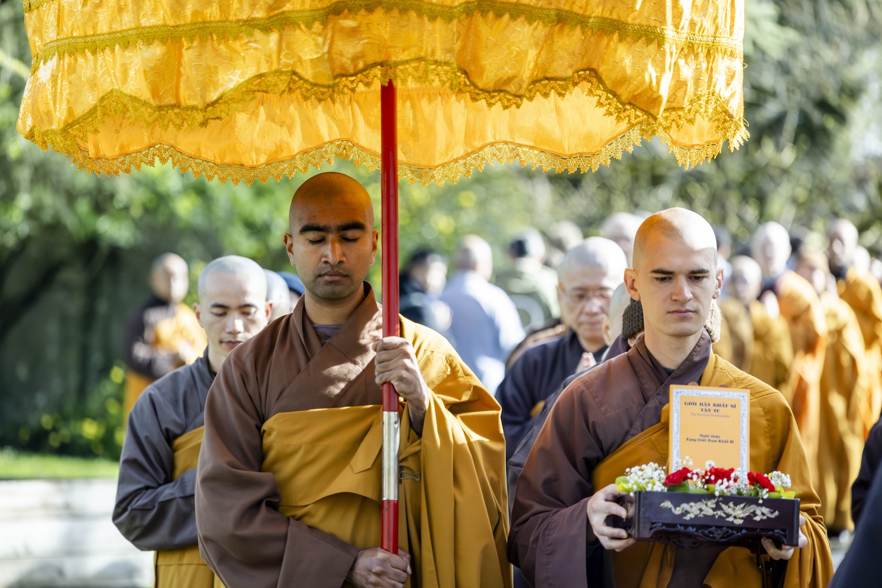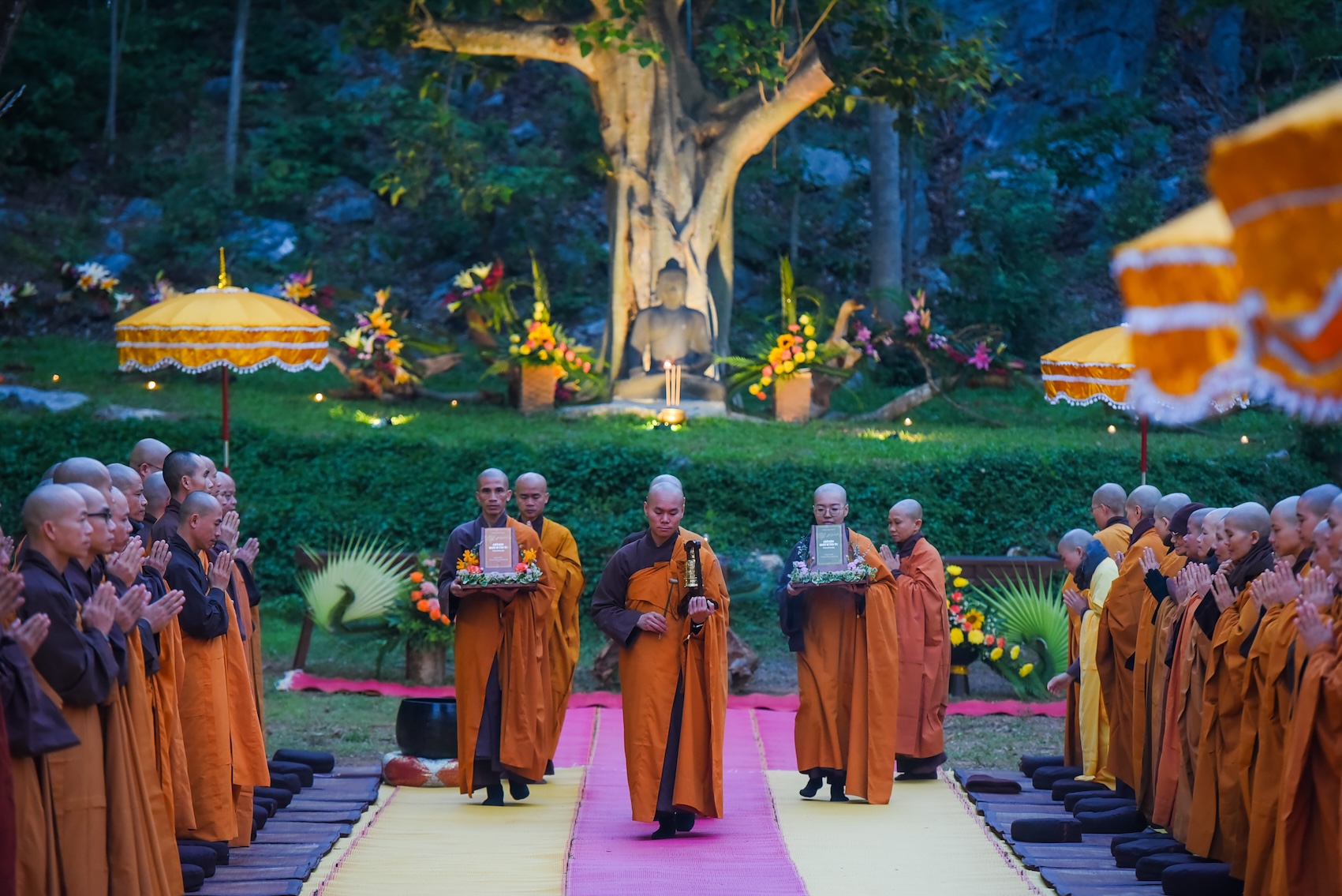 Trong không khí trang nghiêm và thanh tịnh, từng bước chân chậm rãi của các vị xuất sĩ trong y vàng rực rỡ hoà cùng tiếng chuông, tiếng trống bát nhã vang vọng khắp núi đồi xóm Thượng. Đất trời như rung động, hoan hỷ trước sự thành kính của các giới tử và đại chúng, những người một lòng cầu thỉnh giới pháp của Bụt – là ánh sáng soi đường cho sự thực tập, chuyển hoá và phụng sự.
