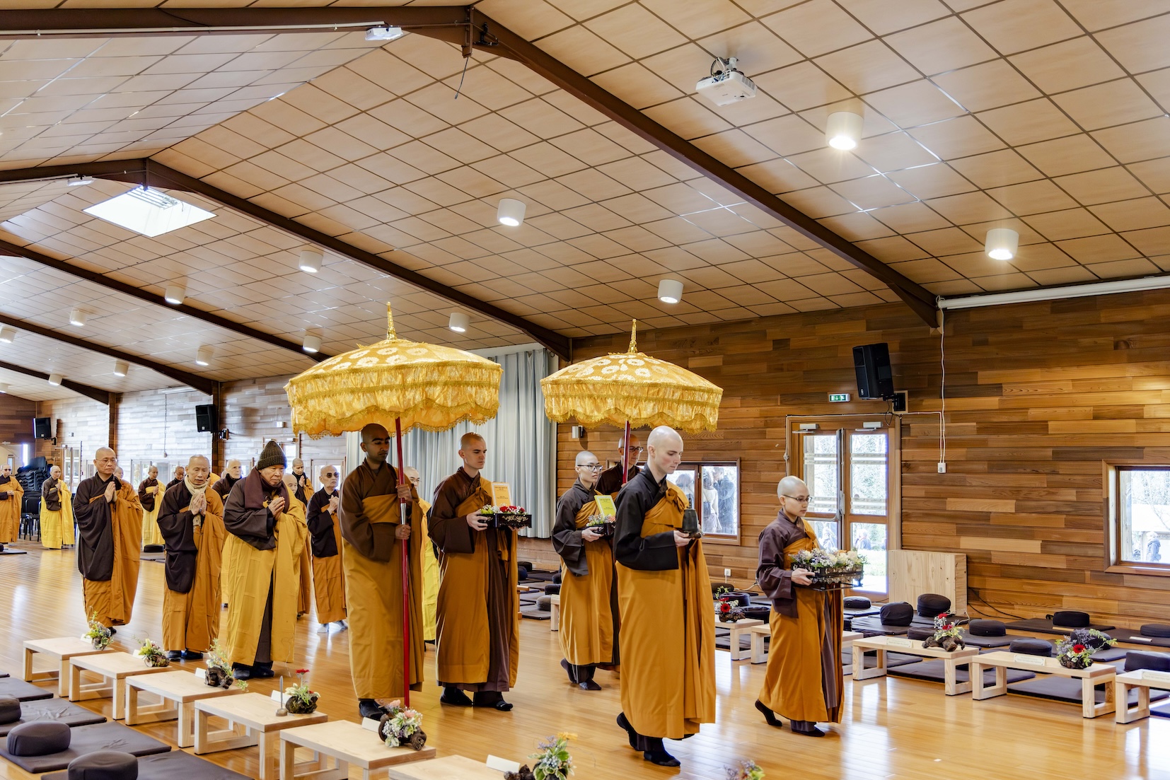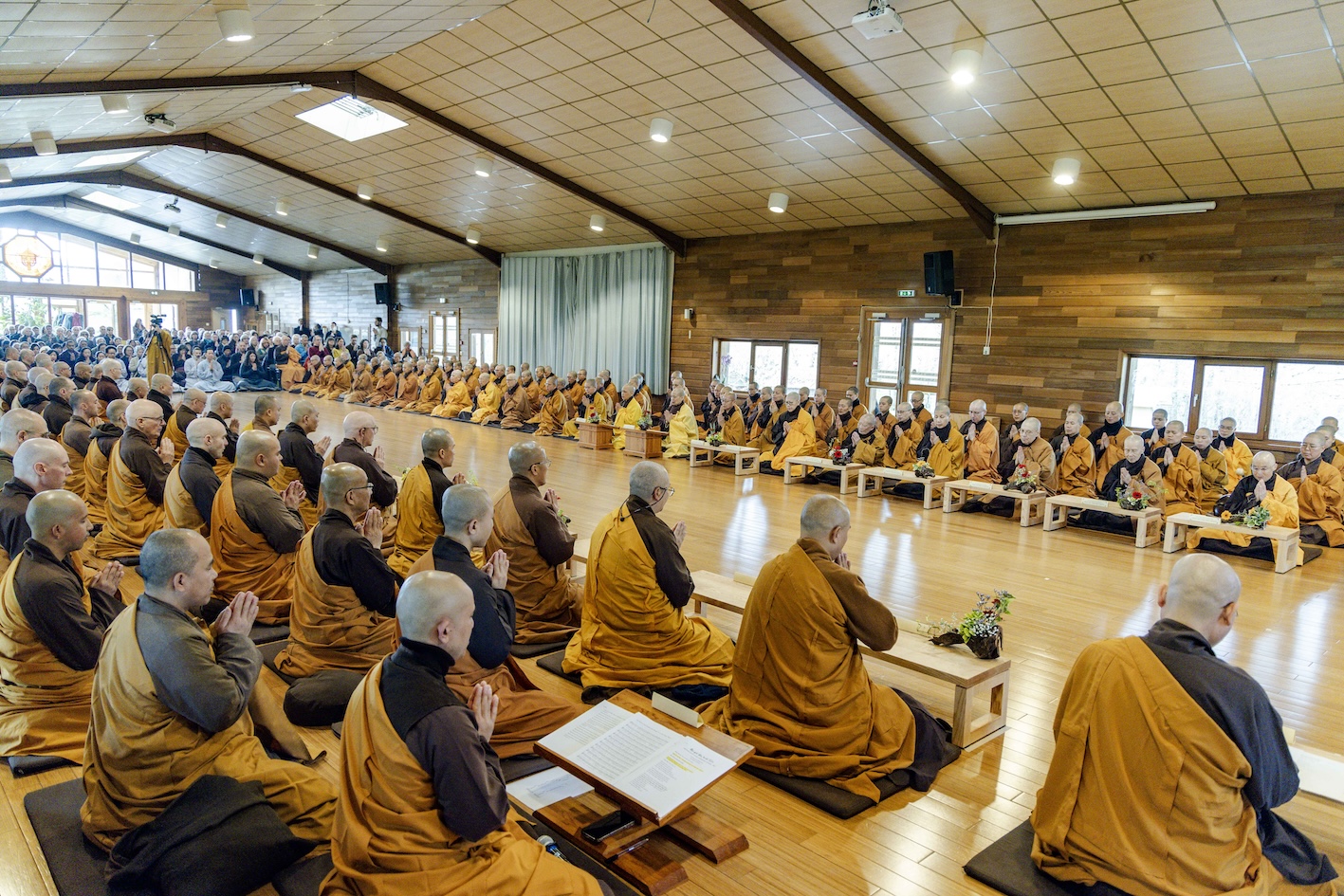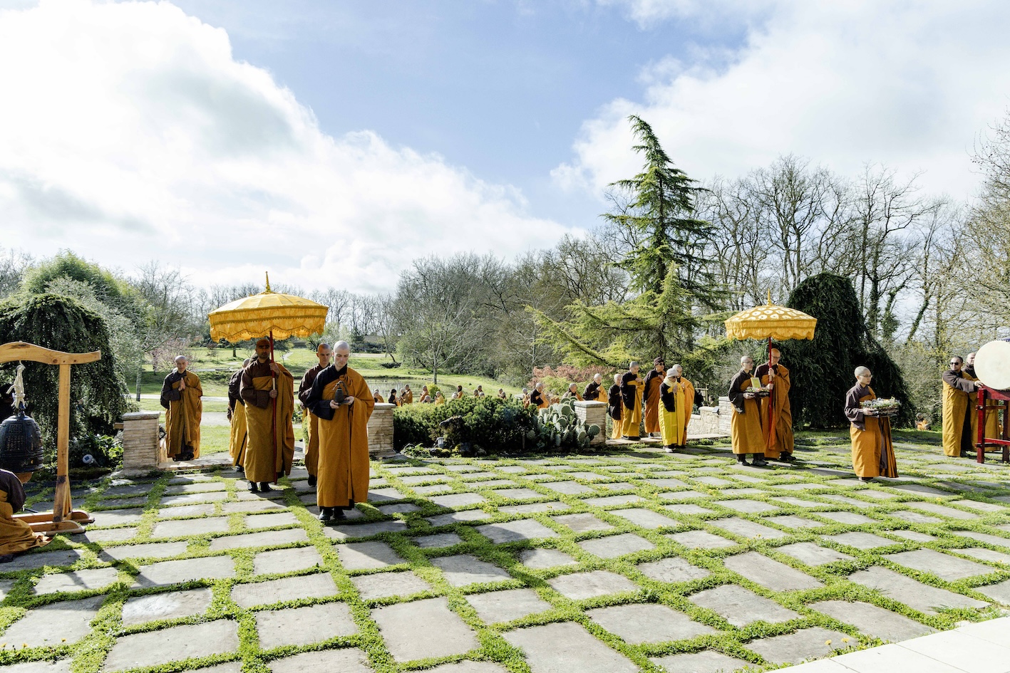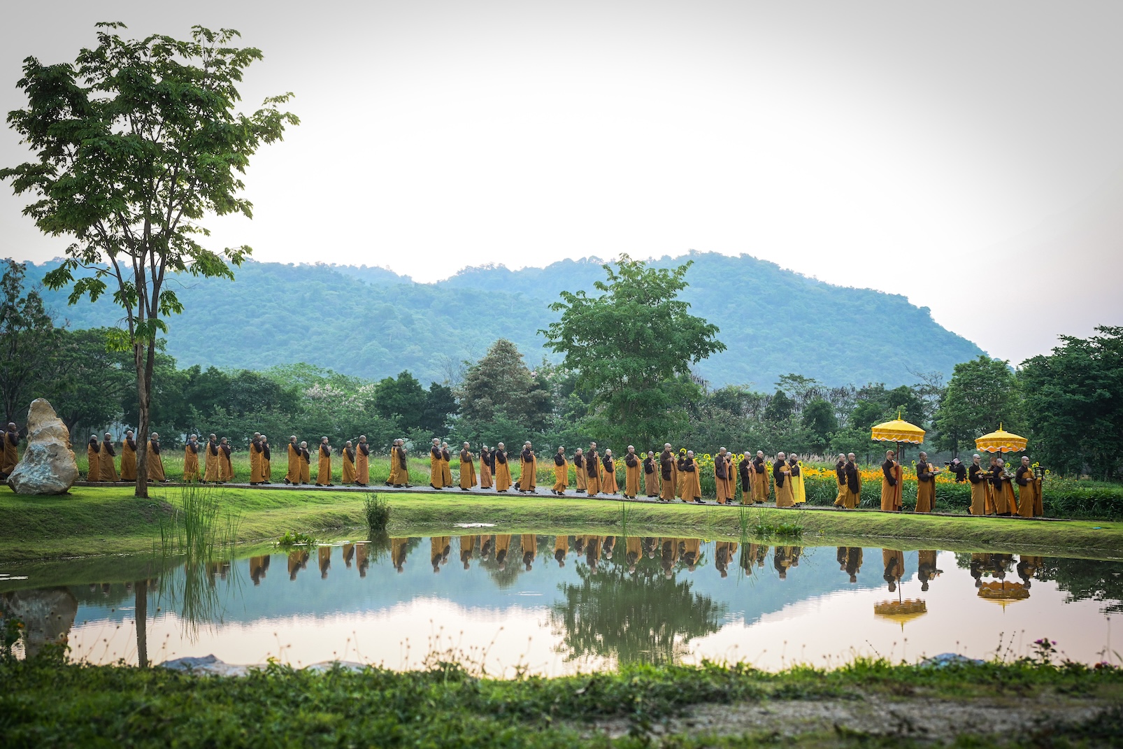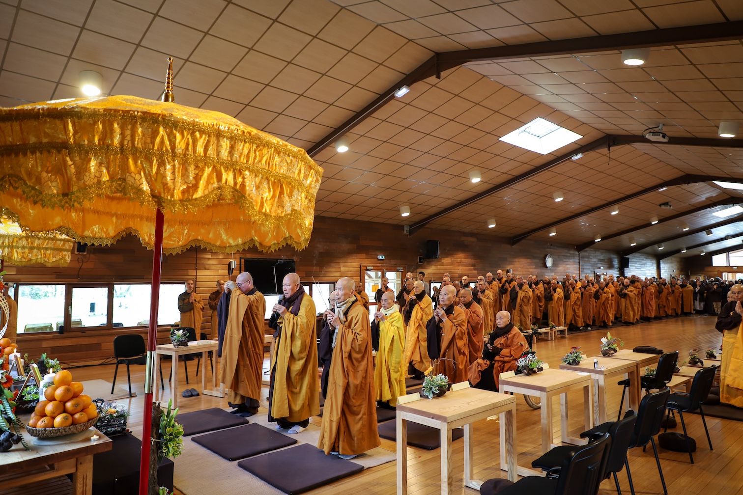 Trong không khí trang nghiêm và thanh tịnh, từng bước chân chậm rãi của các vị xuất sĩ trong y vàng rực rỡ hoà cùng tiếng chuông, tiếng trống bát nhã vang vọng khắp núi đồi xóm Thượng. Đất trời như rung động, hoan hỷ trước sự thành kính của các giới tử và đại chúng, những người một lòng cầu thỉnh giới pháp của Bụt – là ánh sáng soi đường cho sự thực tập, chuyển hoá và phụng sự.
