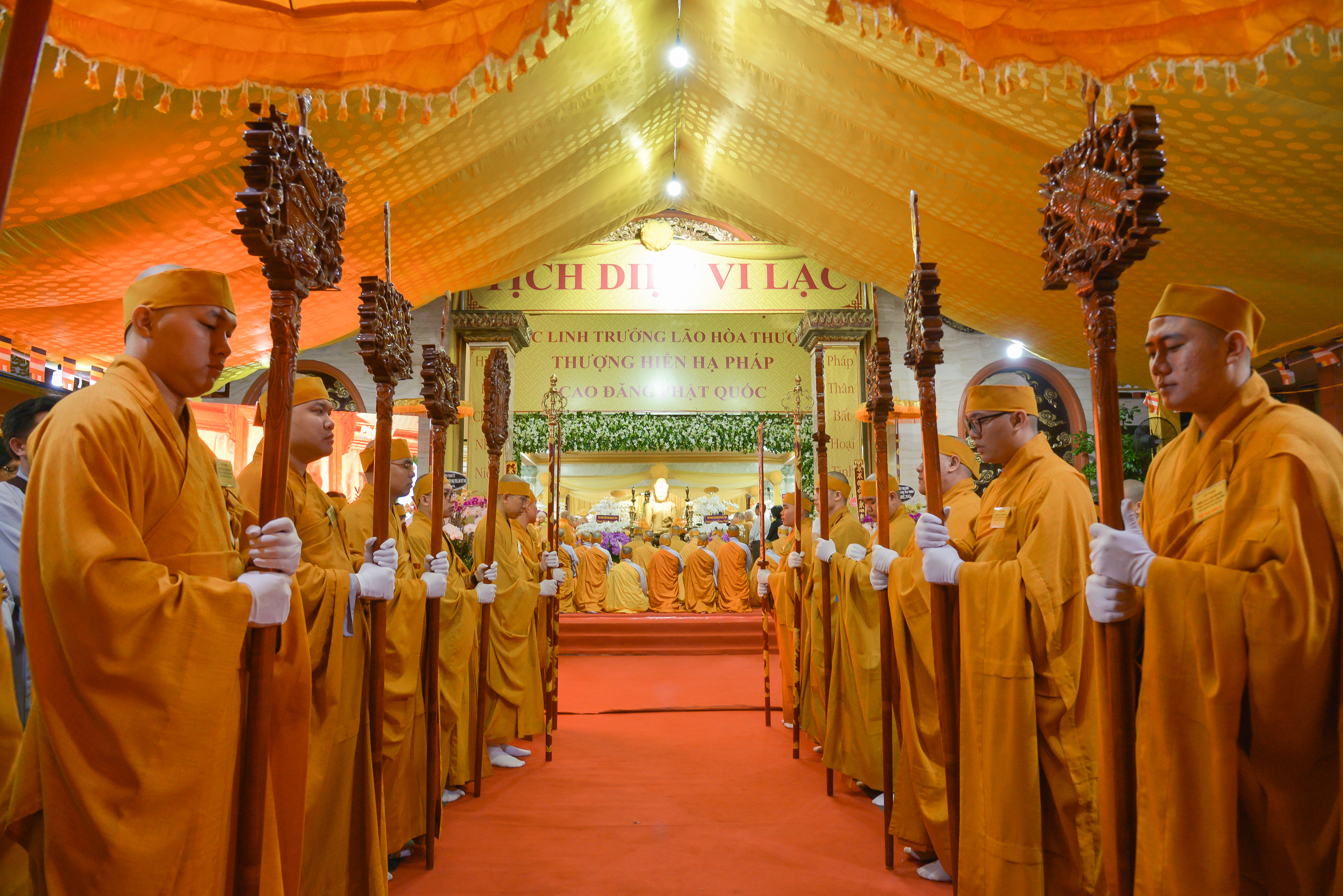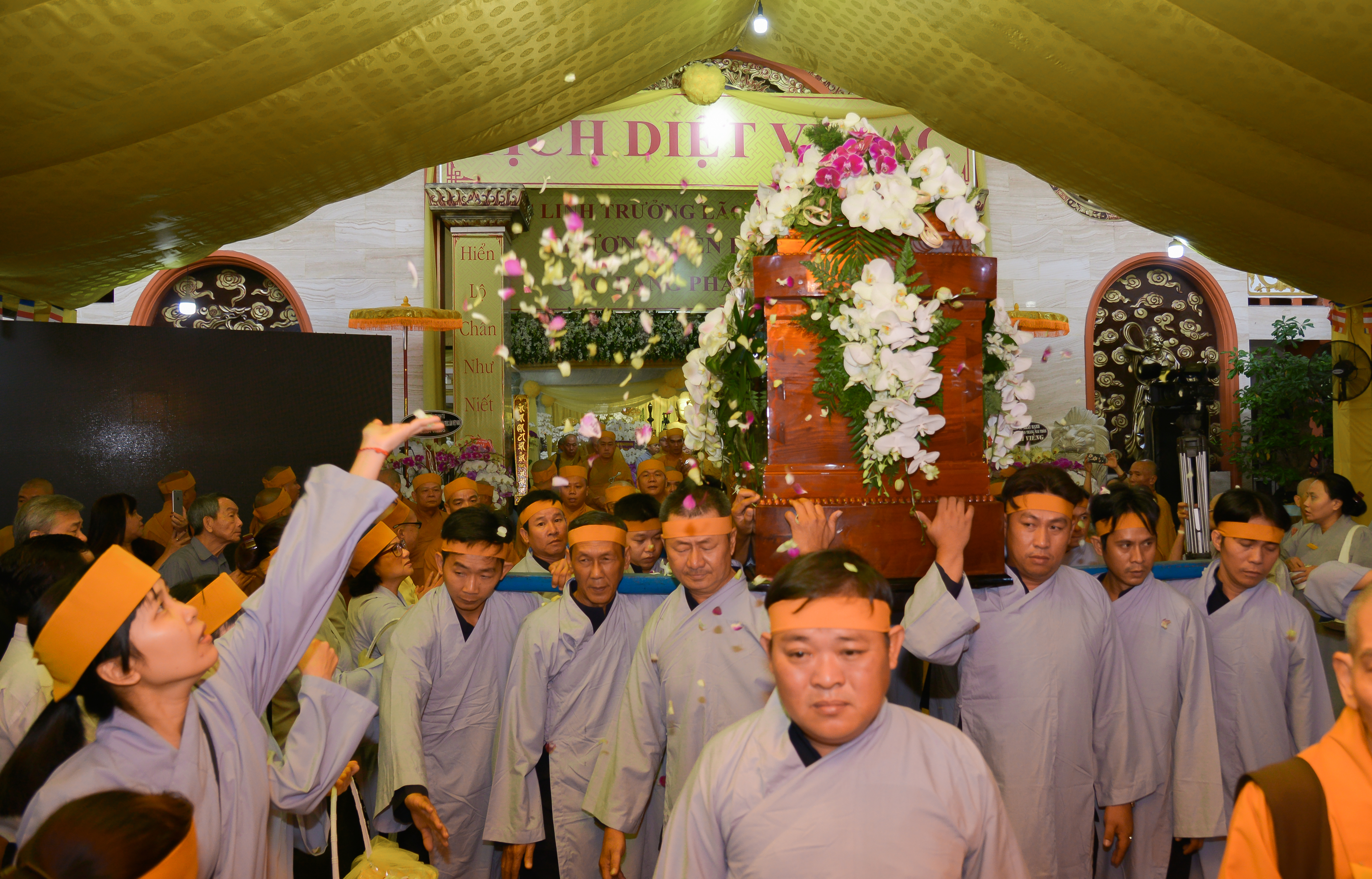 Hoà thượng Thích Hiển Tu tuyên pháp ngữ, phất trần; chư tôn đức Ban Nghi lễ thực hiện các nghi thức cung thỉnh bát hương, long vị, di ảnh, di quan Trưởng lão Hòa thượng rời Giác linh đường.