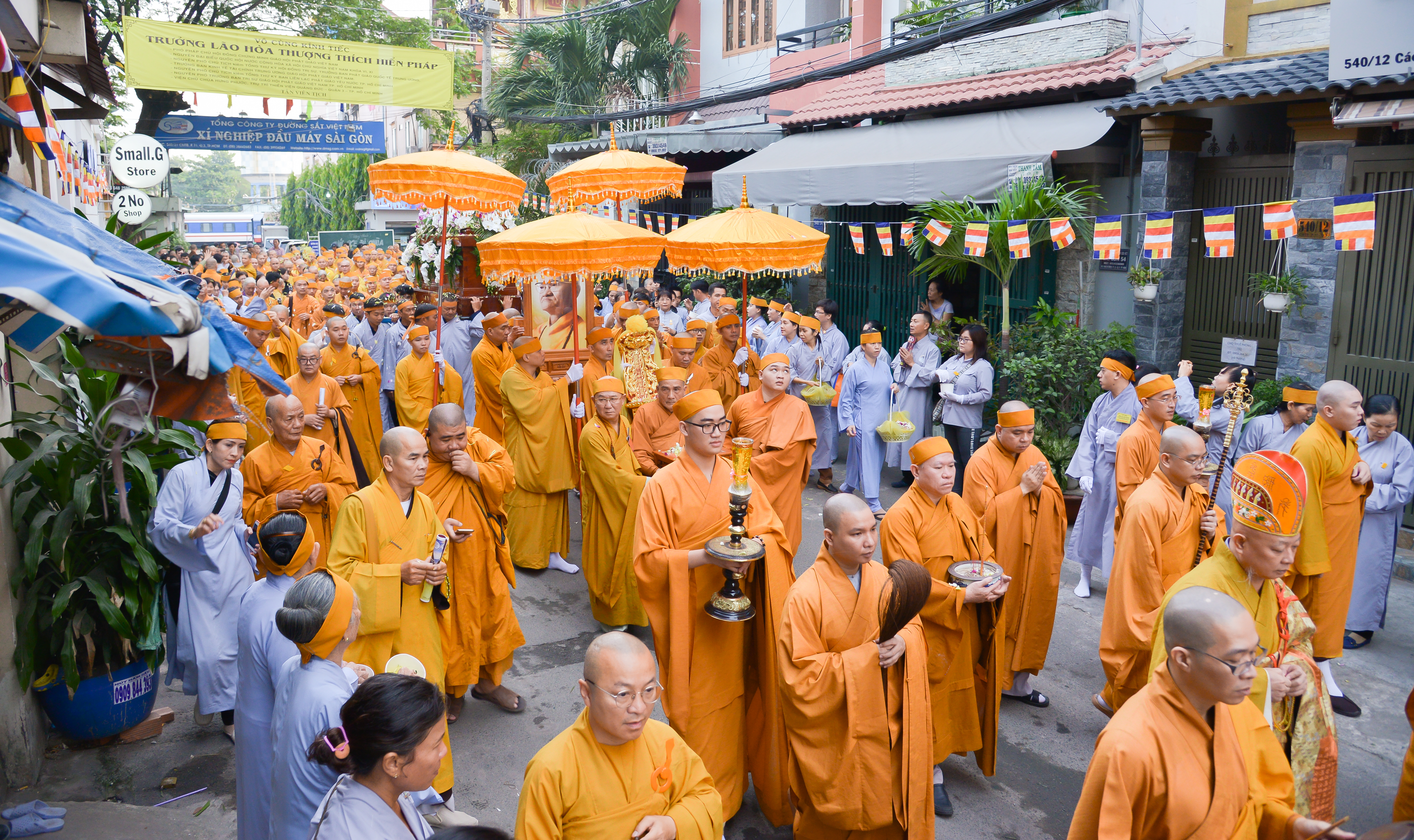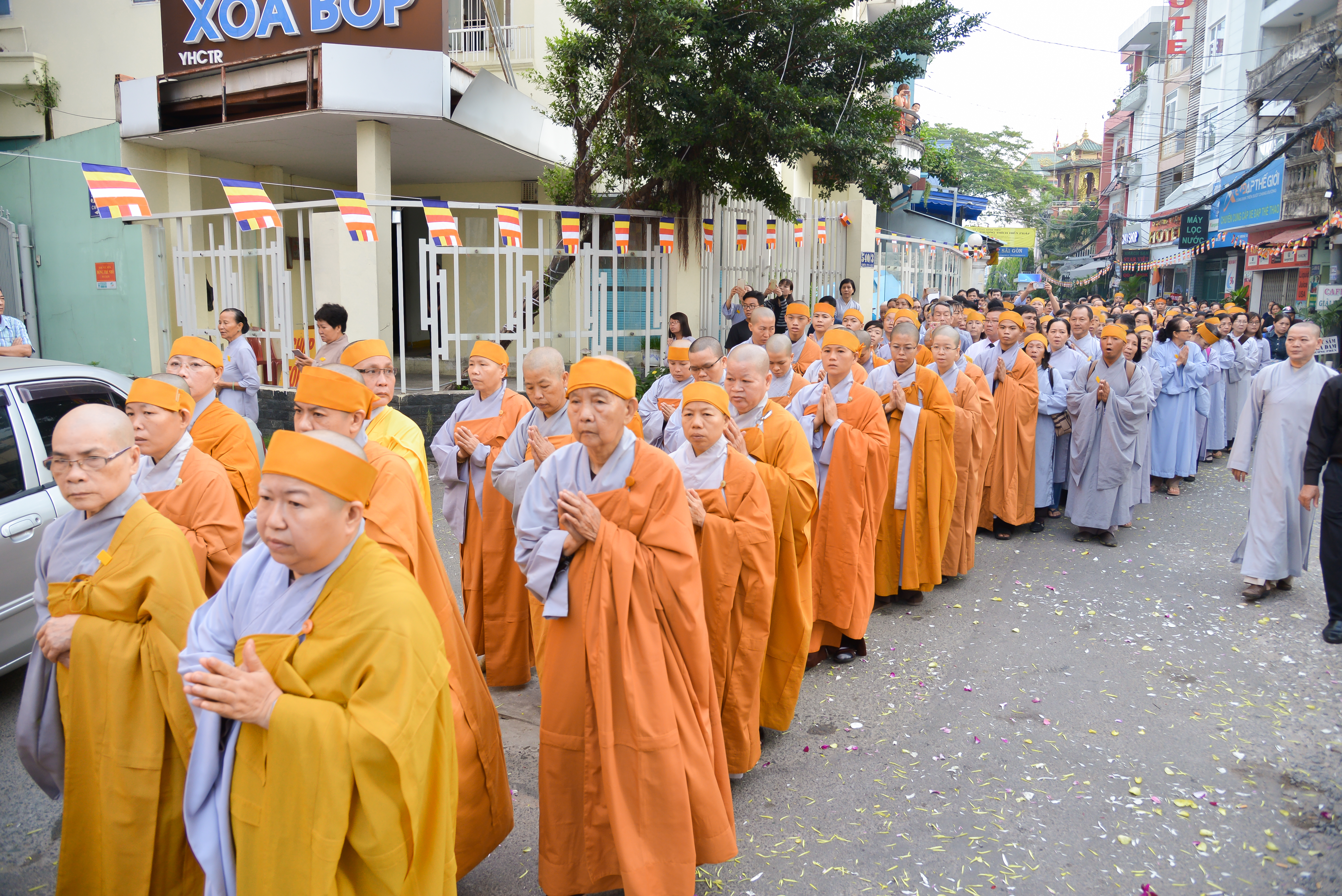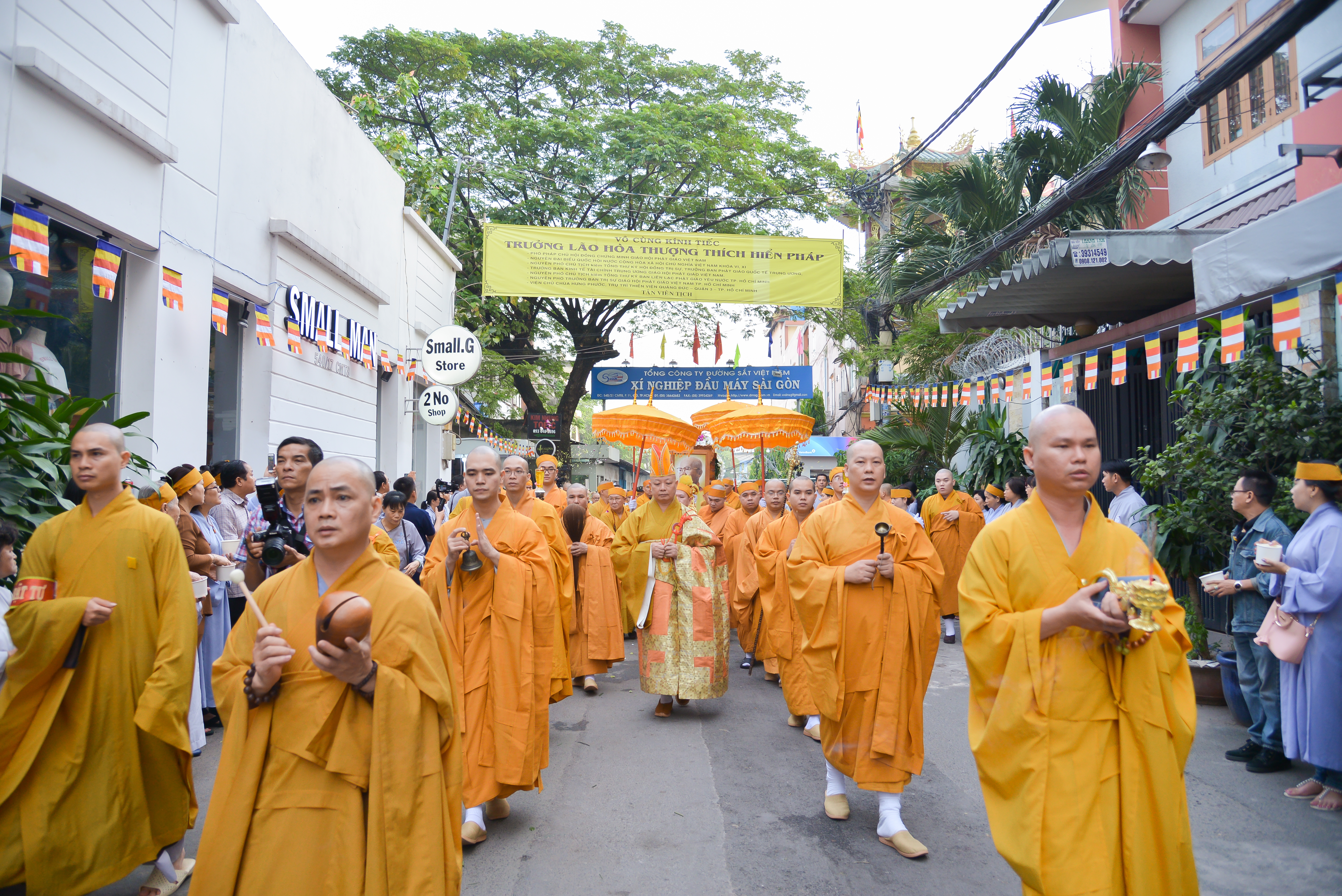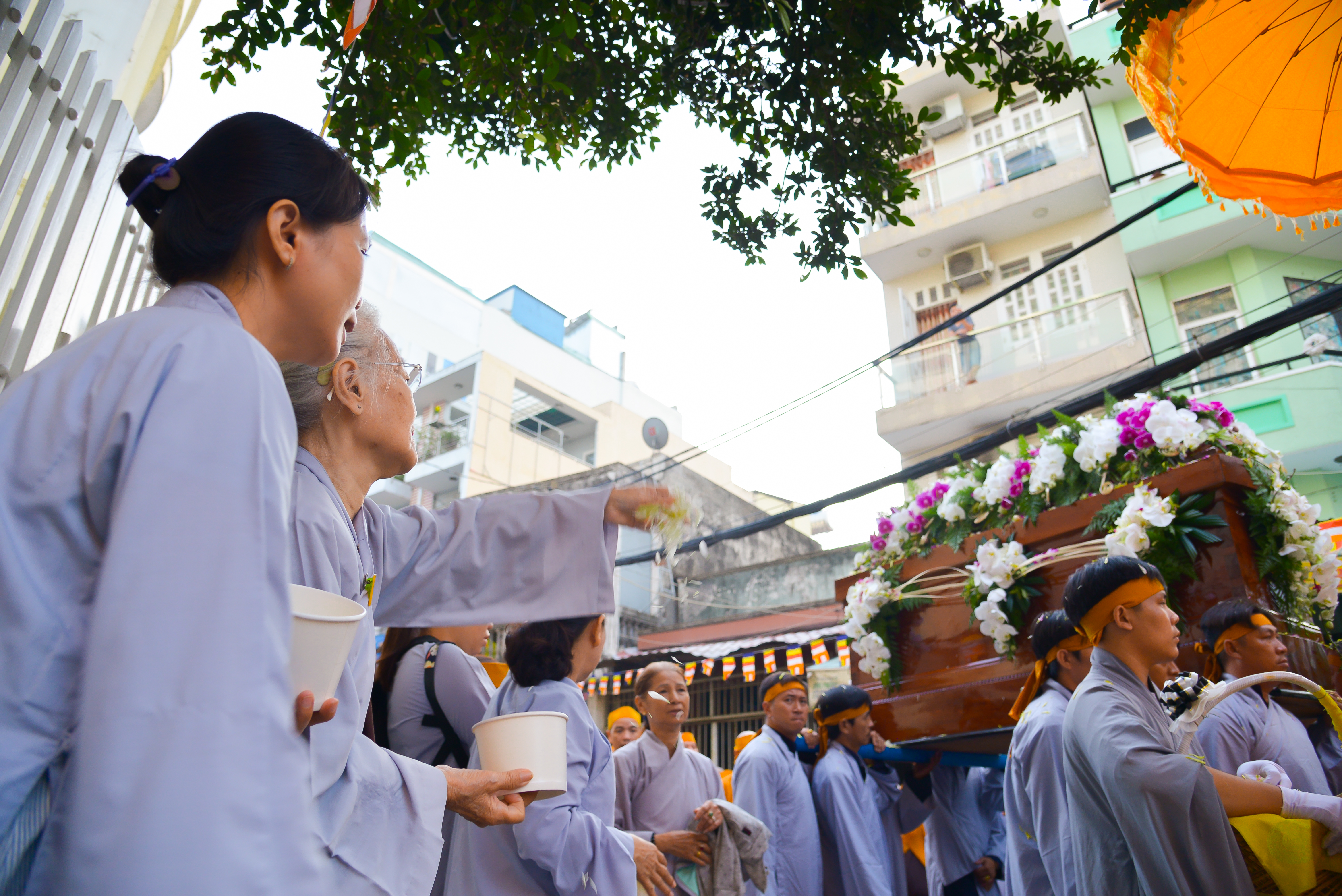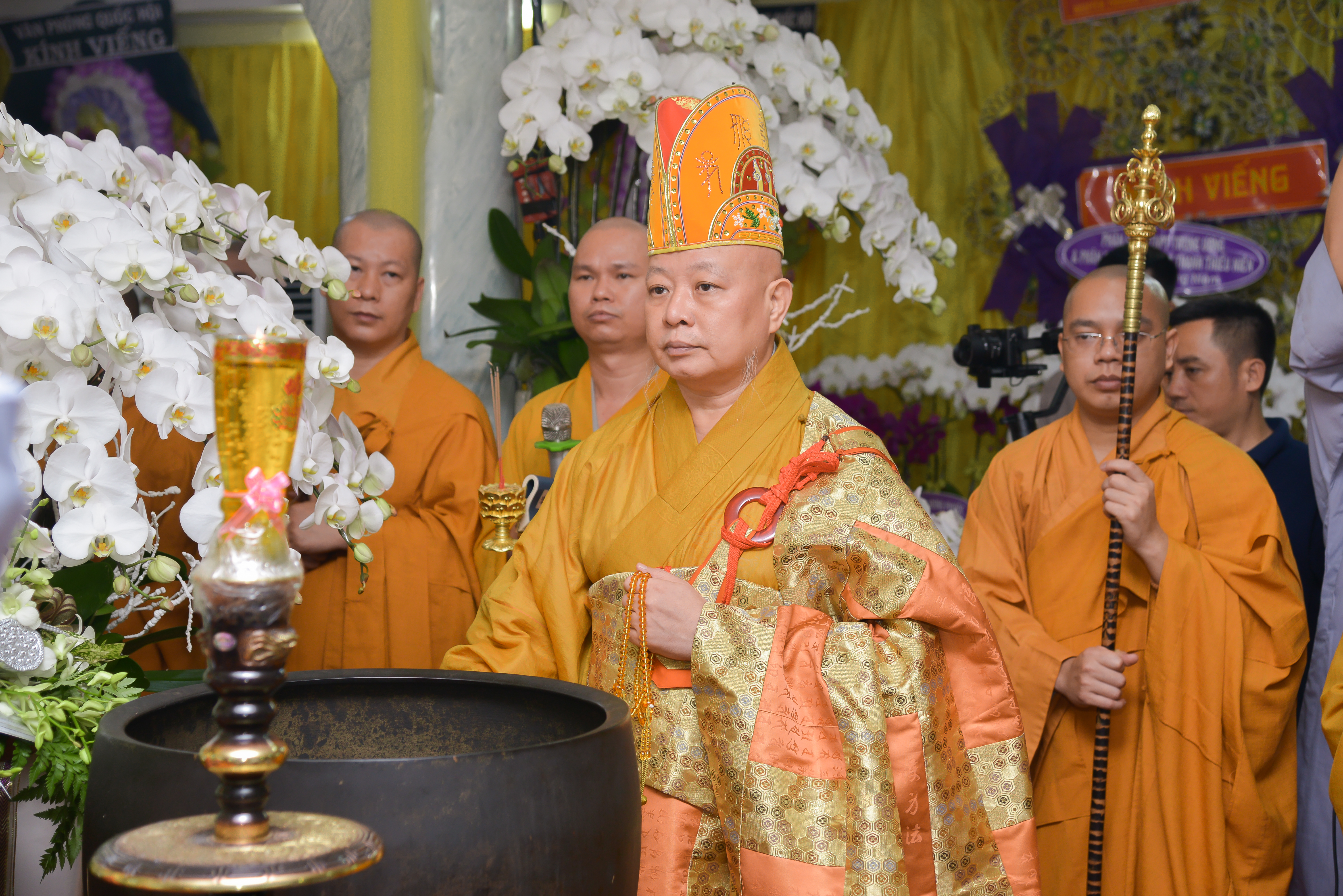 “Hôm nay, trong giờ phút nghìn thu vĩnh biệt này, Trưởng lão Hòa thượng hóa duyên đã mãn, nơi cõi Niết-bàn vô tung bất diệt, Giác linh Trưởng lão Hòa thượng đã tự tại thong dong, vận thần thông đoạn ngự bảo liên đài, xả báo thân, chứng nhập Pháp thân, siêu Tịnh độ. Giờ đây, trước Giác linh đài, chúng tôi HĐCM, HĐTS, các Ban, Viện T.Ư, BTS GHPGVN TP.HCM…,là những pháp hữu Đại thừa đồng hành, đồng sự trong Chánh pháp, là những người còn ở lại, còn nặng nghĩa Thích tử côn bằng, nay thắp nén tâm hương kính cẩn dâng lên cúng dường Giác linh Trưởng lão Hòa thượng để gọi là thể hiện mối tâm giao, tình pháp lữ muôn đời trong Chánh pháp”, Hòa thượng dâng lời tưởng niệm, tiễn biệt.