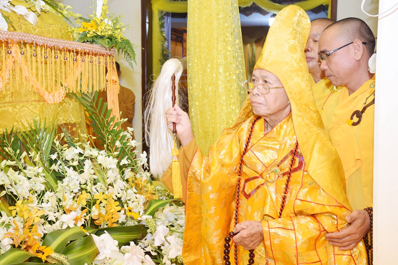 Trong không khí trang nghiêm, thành kính; Trưởng lão Hòa thượng Thích Huệ Ấn – Thành viên HĐCM GHPGVN đã cử hành lễ Phất trần, thỉnh kim quan thăng thượng giá và cung tống kim quan cố Trưởng lão Hòa thượng nhập Bảo tháp.