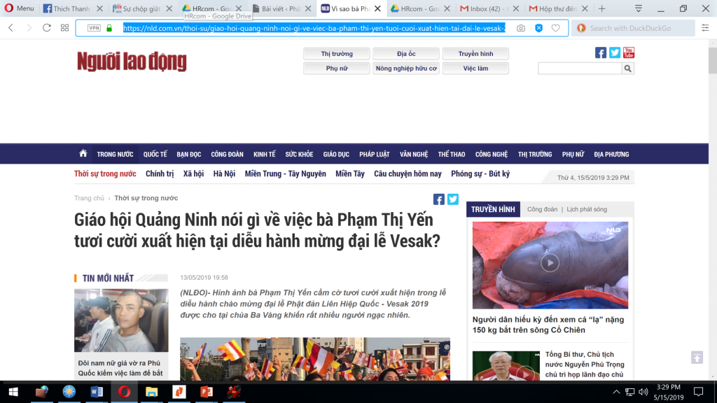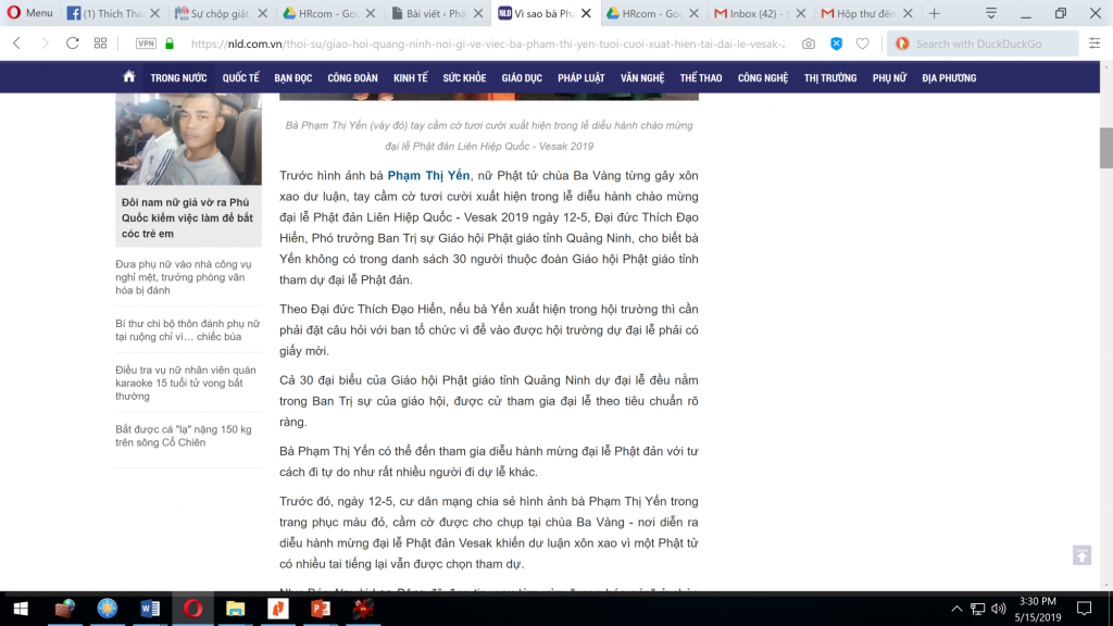 – *Chiên P.Viên: Huyên Nguyễn-Nguyễn Thị Huyên(Báo Lao Động) -Tất cả mọi sư nguyên nhân là đây: 1/ Chùa Phúc Khánh: “Dâng sao giải hạn”. 2/ Chùa Bái Đính-Chùa Tam Chúc: “Chùa lớn Phật to, kinh doanh thần thánh”. 3/Chùa Ba Vàng: “Thỉnh vong, oan gia trái chủ”. 4/ Cha Long-Giao điểm LTXC…Những nhân tố chính phất cờ chống phá đạo Phật. xâm nhập vào Chùa, soi mói viết bài báo đăng tin xuyên tạc đạo Phật, gây chia rẽ tôn giáo, mất an sinh trật tự xã hội?..Thật kỳ lạ đều mang mác Phóng viên báo.& Nhà Văn hóa Dân tộc học..v.v.. .Đằng sau là cả một tổ chức chiến binh “Mafia”. (Hình dưới là PV Báo Lao Động, Thâm nhập Chùa Ba Vàng và viết bài xuyên tạc cách hành lễ của Chùa Ba Vàng, tạo cái nhìn không đẹp “Buôn bán thần thánh-Mê tín dị đoan” dưới góc nhìn của một Kyto Đạo Thiên Chúa! .