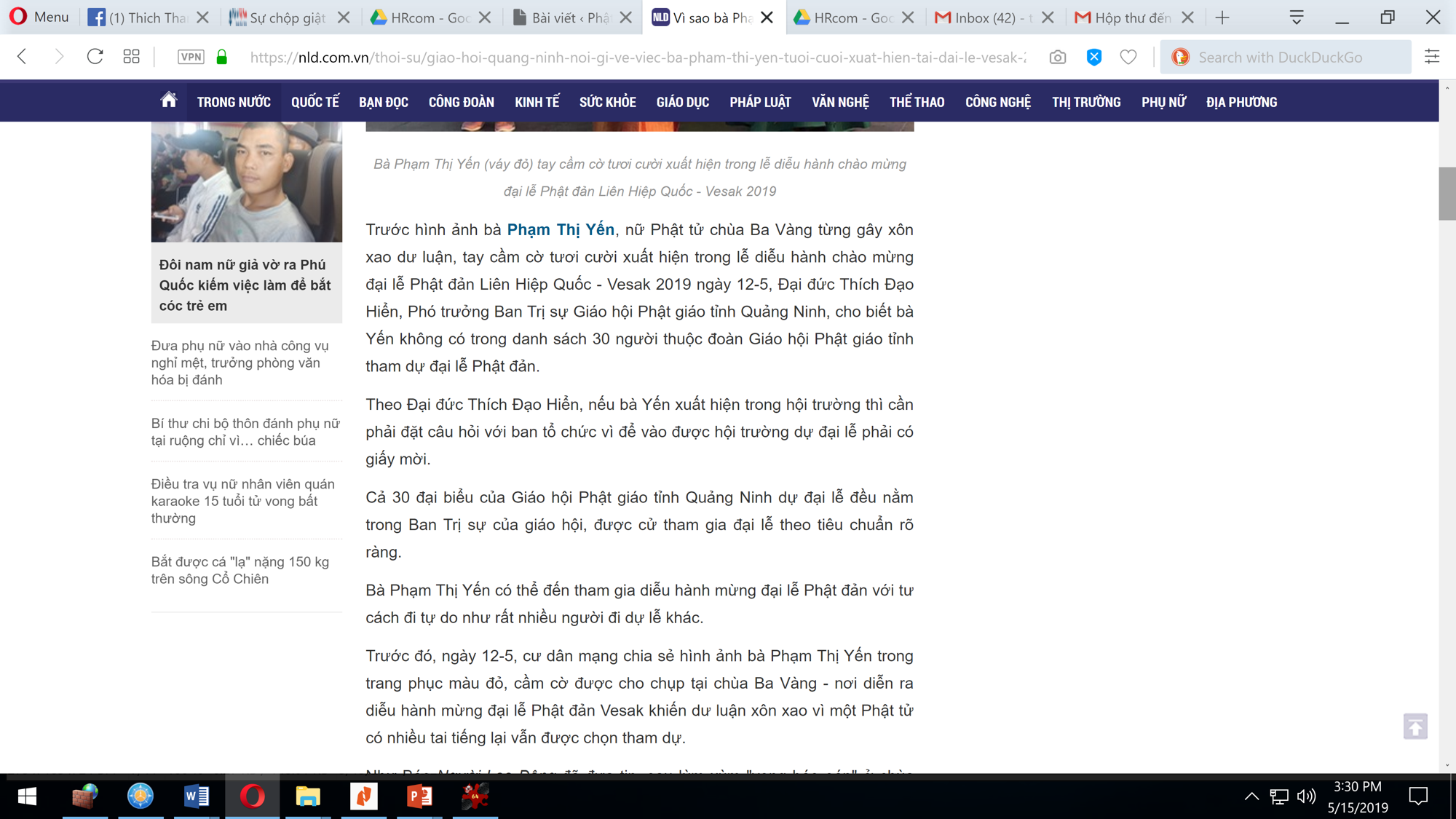Như đã đề cập trong bài Thêm một bằng chứng sống động về sự chộp giật của báo chí liên quan đến chùa Ba Vàng, báo Người Lao động đã có sai sót khi viết bài đề cập chuyện Phật tử Yến diễu hành mừng Phật đản tại chùa Tam Chúc (Hà Nam) khi Đại lễ Vesak đang diễn ra trong khi thực tế Phật tử này đang diễu hành mừng Phật đản tại chùa Ba Vàng.