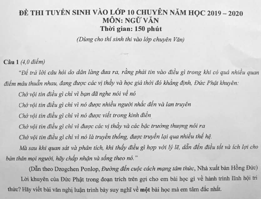 Nhiều thí sinh tỏ ra thích thú với câu 1 khi trích dẫn lời khuyên của Đức Phật trong tác phẩm Đường đến cuộc cách mạng tâm thức (dẫn theo Dzogchen Ponlop). Đề yêu cầu thí sinh rút ra bài học về hành trình lĩnh hội tri thức từ lời khuyên trên.
