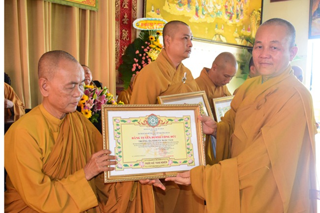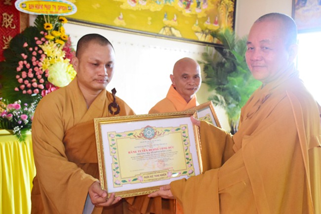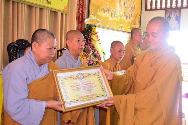 HT. Thích Minh Thiện – UV HĐTS, trưởng BTS GHPGVN tỉnh LA, trưởng BTC đã trao bằng tuyên dương công đức cho 9 trú xứ ACKH trong tỉnh.