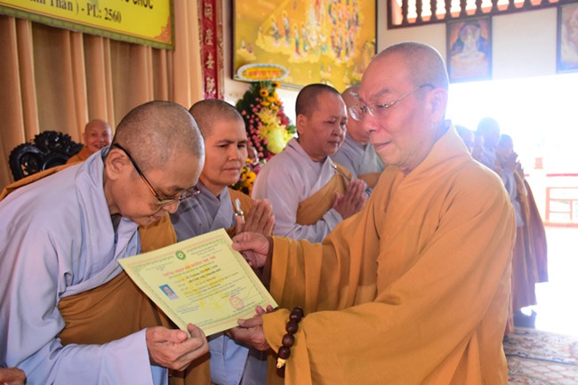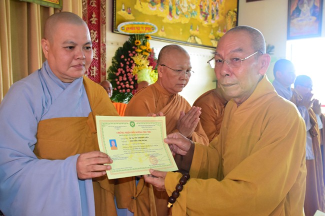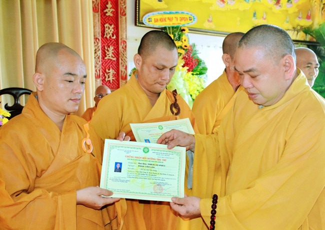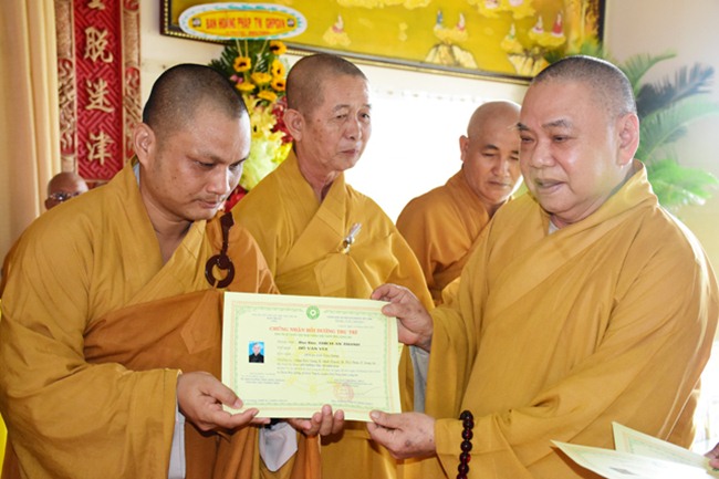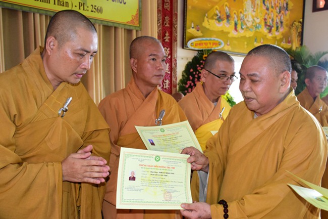 HT.Thích Thiện Pháp – Phó chủ tịch Thường trực HĐTS GHPGVN, trưởng ban Tăng sự TW trao giấy chứng nhận cho chư tôn đức khóa sinh.