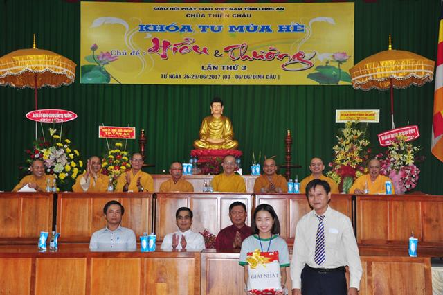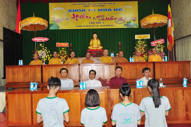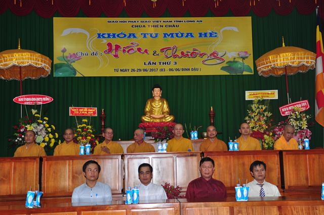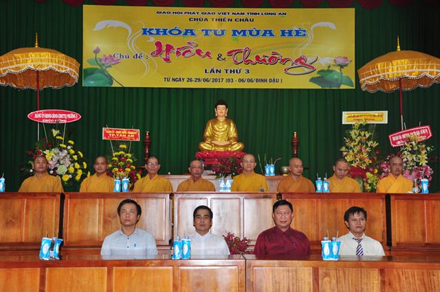 Quang lâm chứng minh tham dự có chư tôn đức giáo phẩm: HT. Thích Thiện Huệ- Chứng minh Ban trị sự GHPGVN tỉnh Long An; HT.  Thích Minh Thiện- UVHĐTSTƯ, Phó ban Hoằng pháp trung ương, Trưởng Ban trị sự GHPGVN tỉnh Long An, Trụ trì chùa Thiên Châu, Trưởng Ban tổ chức khoá tu; ĐĐ. Thích An Nhựt- Trưởng Ban Hướng dẫn Phật tử GHPGVN tỉnh Long An; ĐĐ. Thích Lệ Duyên- Thư ký Ban Tăng sự GHPGVN tỉnh Long An; ĐĐ. Thích Lệ Ngôn – Phó văn phòng học viện  Phật giáo Việt Nam tại Tp HCM; TT. Thích Lệ Tấn- Phó thường trực BTS. GHPGVN liên huyện Tân Thạnh-TX Kiến Tường- Vĩnh Hưng . Tp. HCM cùng Chư tôn đức  ban trị sự tỉnh, huyện đồng  và quý phụ huynh khoá sinh khoá tu mùa hè về tham dự.