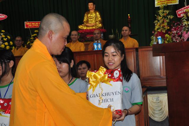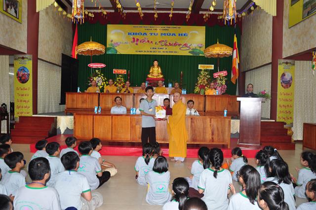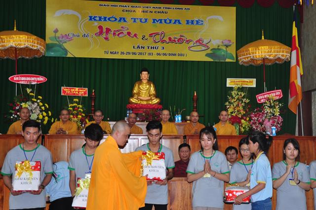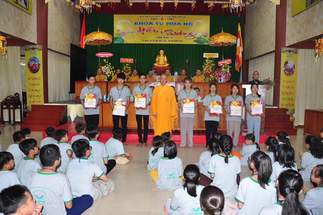 Tiếp theo đó Đại Đức Thích An Tấn thay mặt ban điều phối chương trình mời các em phát biểu cảm tưởng tri ân chư Tôn đức  tổ chức khoá tu và tri ân cha mẹ thông qua phát thưởng cho các tập thể, cá nhân tốt trong khoá tu. Tiếp ĐĐ. Thích An Tấn cung thỉnh Chư tôn đức chứng minh và quý vị lãnh đạo Chính Quyền phát thưởng cho các em.