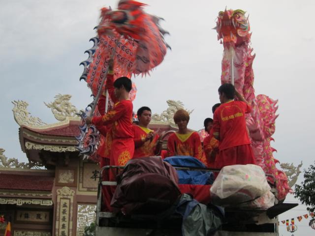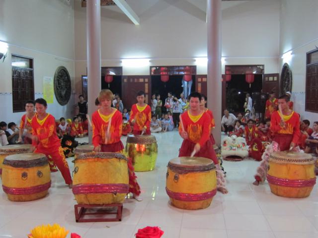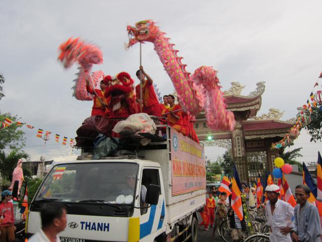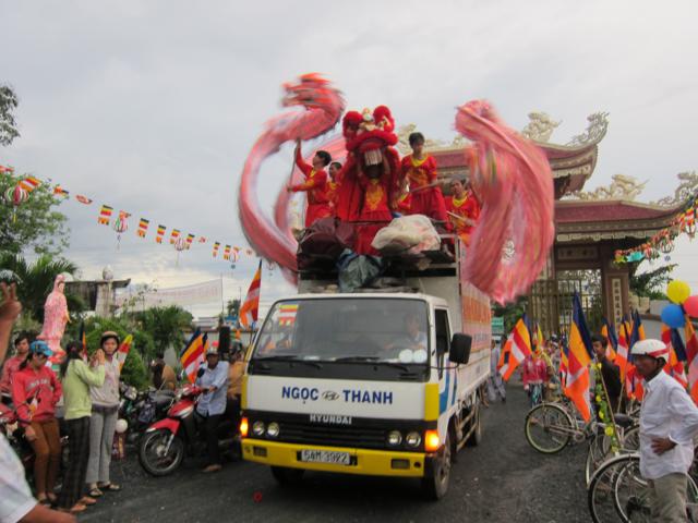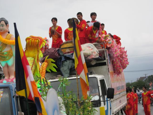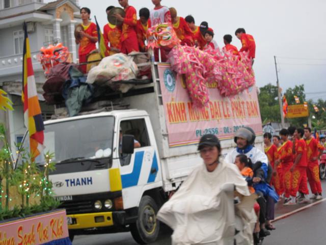Đại đức Thích Minh Thạnh dẫn đầu và cuộc diễu hành đã xuất phát trong mưa. Đi khoảng một km thì trời tạnh dần và chỉ còn lại là những hạt mưa phùn bay lất phất. Có lẽ do trời mưa nên âm thanh không phát được, Lân không múa được, vì những con lân này được các em tự trang trí bằng giấy màu, khi mưa ập đến, lân ướt hết nên không múa được,… Nhiều yếu tố khách quan đã làm cho buổi diễu hành không như ý muốn.