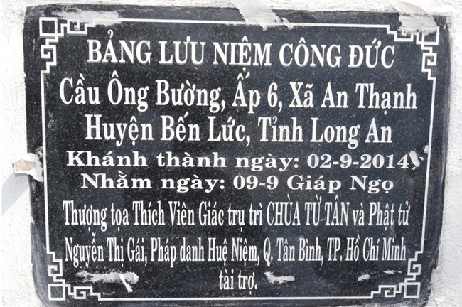 Cầu Ông Bường với chiều dài 25 m ngang 2,5m, được thiết kế bằng bê tông cốt thép, tổng kinh phí là 185 triệu đồng do HT. Thích Viên Giác- Trụ trì Chùa Từ Tân,quận Tân Bình TPHCM và Phật tử Huệ Niệm tài trợ.