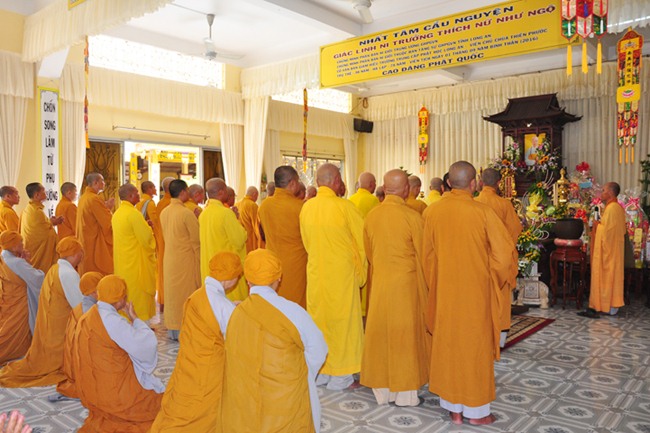 10h15, môn nhân pháp quyến đồng vân tập nơi khách đường, thành kính phủ phục cung thỉnh chư tôn thiền đức Giáo phẩm, quang lâm trai đường chứng minh lễ cúng dường.