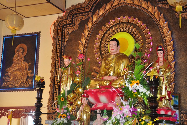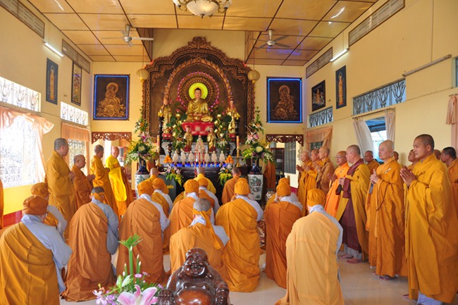 Đúng 9h, môn nhân pháp quyến thành kính cung thỉnh chư tôn giáo phẩm Ban nghi lễ quang lâm đại hùng bảo điện cử hành nghi thức Cúng ngọ, do TT Thích Giác Thiện-trụ trì chùa Phước Long (TG) làm sám chủ.