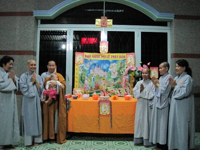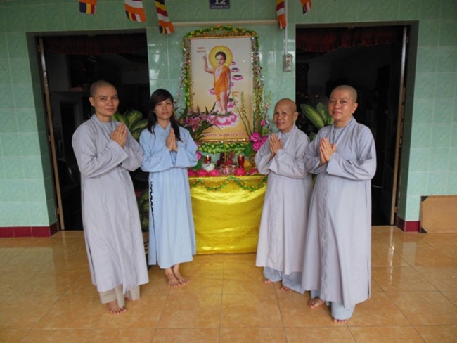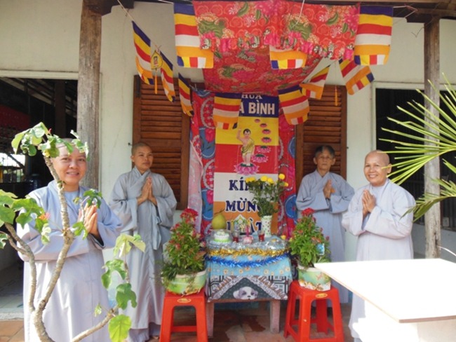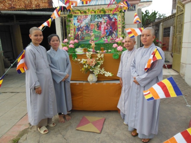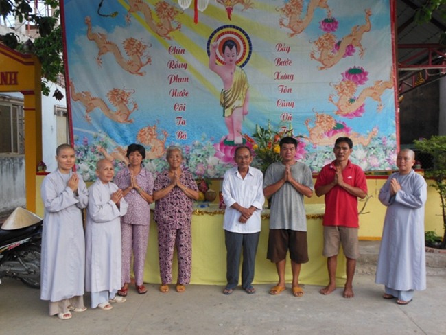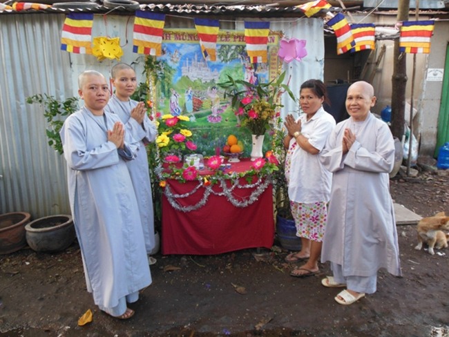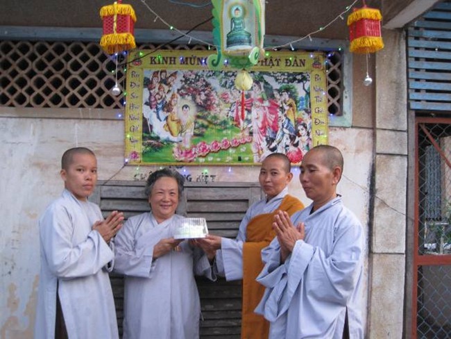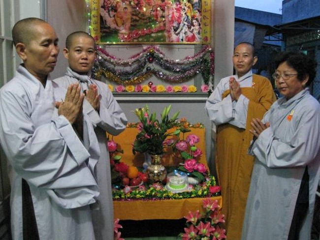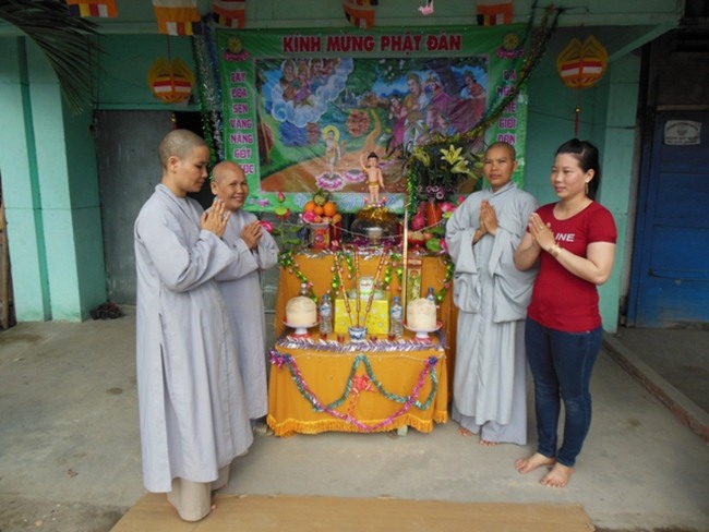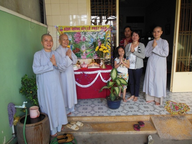 Chiều ngày 14, vâng lời dạy của Thầy, chư Ni chia ra làm 3 đoàn đến từng gia đình một nguyện hương tụng một bài kinh ngắn để chúc phúc và cúng một bánh sinh nhật “KÍNH MỪNG PHẬT ĐẢN” lên Phật.
