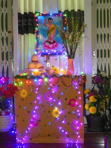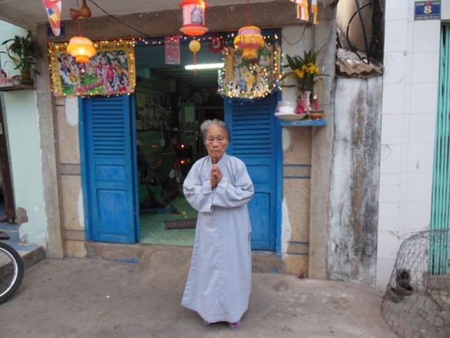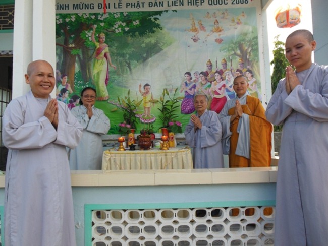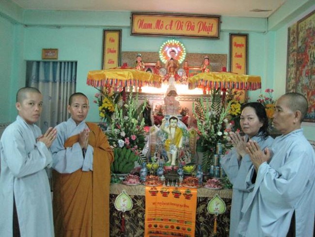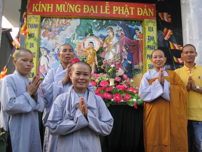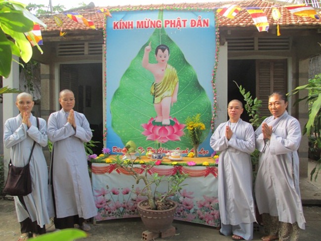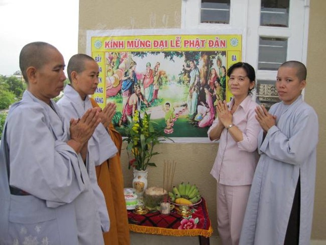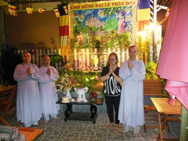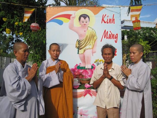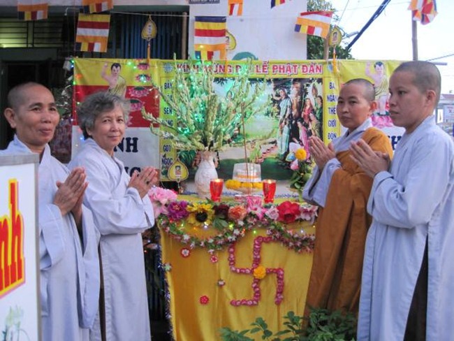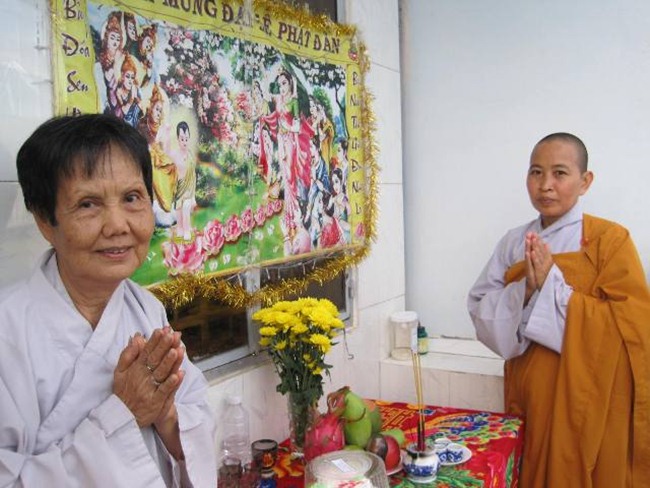 Chiều ngày 14, vâng lời dạy của Thầy, chư Ni chia ra làm 3 đoàn đến từng gia đình một nguyện hương tụng một bài kinh ngắn để chúc phúc và cúng một bánh sinh nhật “KÍNH MỪNG PHẬT ĐẢN” lên Phật.