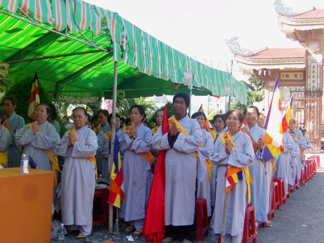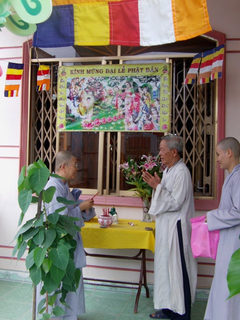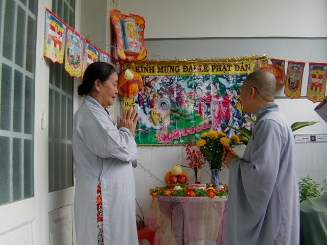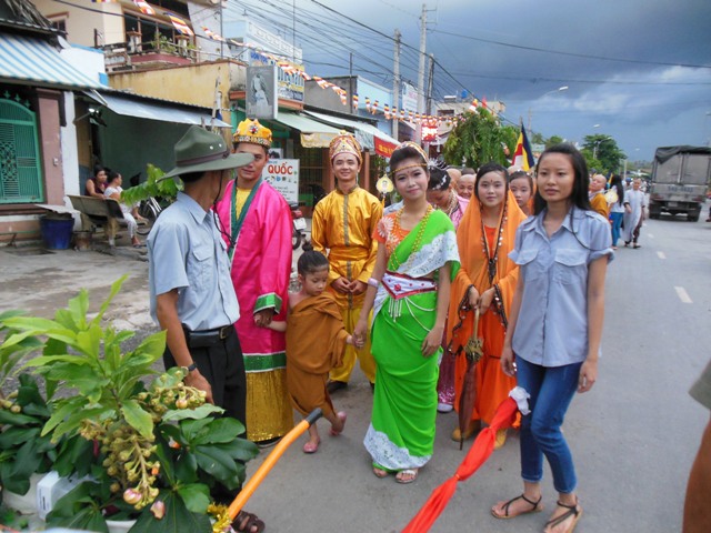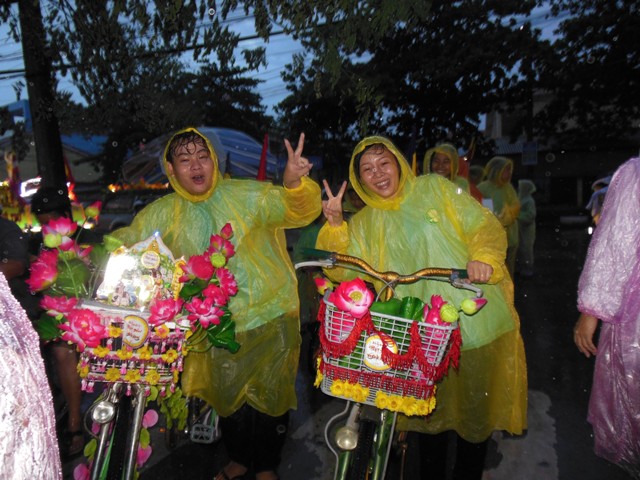 Ngày 14: Chùa tổ chức lễ tắm Phật và diễu hành xe hoa, thả đèn phóng đăng ở dòng sông Cần Giuộc. 17h, những đám mây đen đang dần dần phủ kính mặt bầu trời, Thầy, Quý cô và các bạn Phật tử lo lắng, không biết có đi được không? Và rồi,bầu trời cũng nhẹ nhàng trút nước như muốn tham gia tắm Phật cùng với Phật tử vùng này. Tuy mưa lớn dần lên nhưng trời không nỗi gió.
