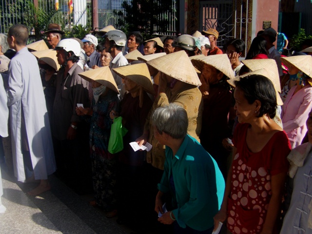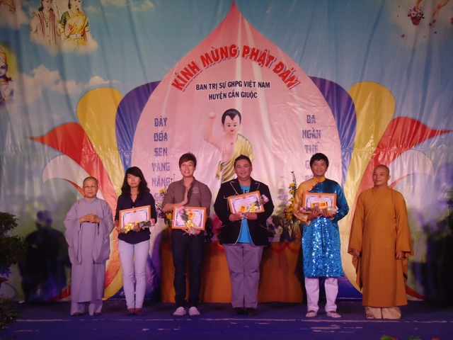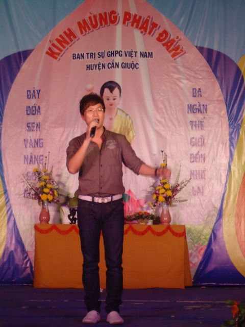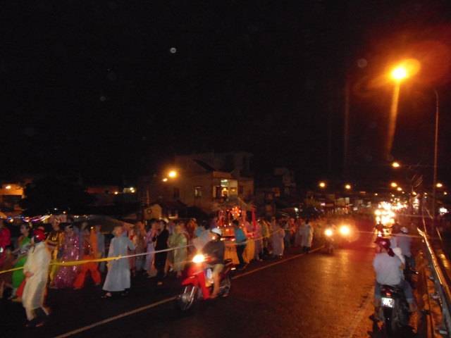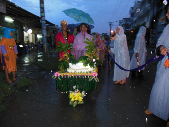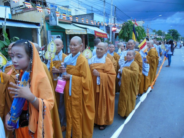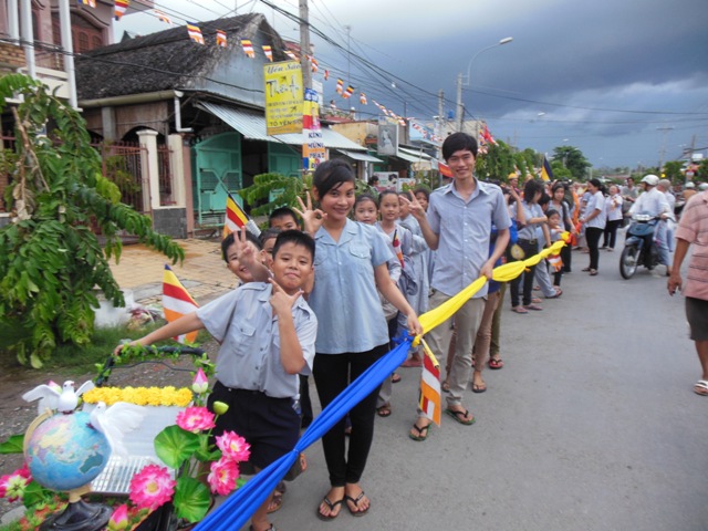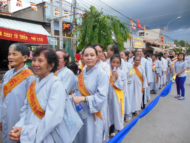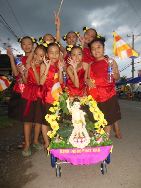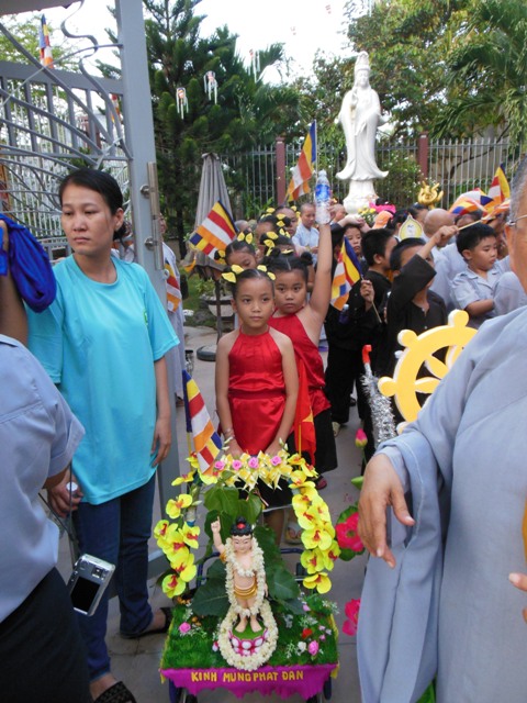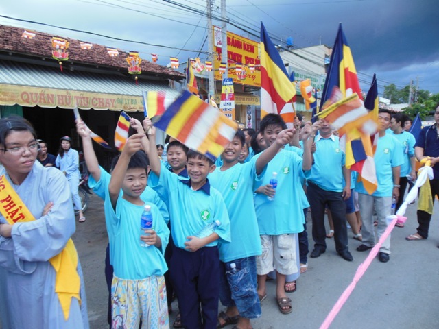 Chiếc xe ba bánh được thiết kế như chiếc kiệu nhỏ rước Đấng sơ sinh với đoàn theo sau là Quý Phật tử lớn, các bạn áo thun kính mừng Phật đản và những chiếc xe đạp. Cuối cùng là những chiếc xe hoa của các chùa trong huyện. Cả đoàn đi trong trật tự. Trời càng lúc càng mưa lớn vẫn không sao lấn át được tiếng niệm Phật râm ran của cả đoàn. Ai ai cũng vừa đi vừa niệm: Nam Mô Bổn Sư Thích Ca Mâu Ni Phật. Những người hai bên đường đi rất cảm động. Họ cũng hòa chung tiếng niệm Phật của cả đoàn. Đến cầu Cần Giuộc thì đội hoa đăng cũng kịp thả ba đóa sen xuống sông cho cả đoàn chiêm ngưỡng và cầu nguyện. Do mưa lớn nên những cây đèn cầy khó chịu, chúng là khó người đốt, cứ đốt lên sau tiếng xèo………xèo là tắt hẳn. Tuy thế, đội cũng đốt hết cả 7 đóa.