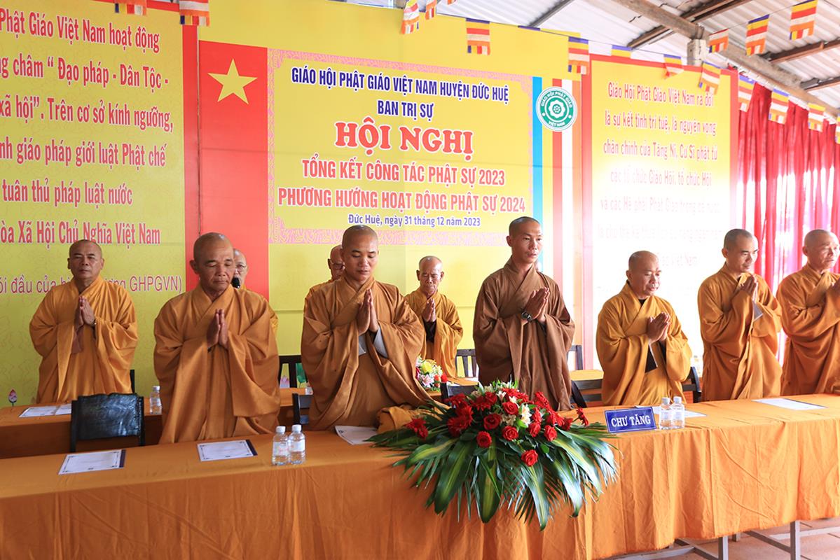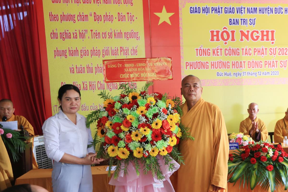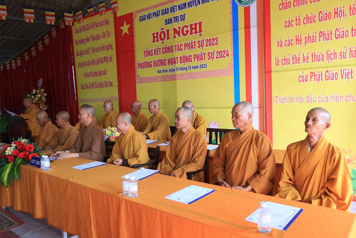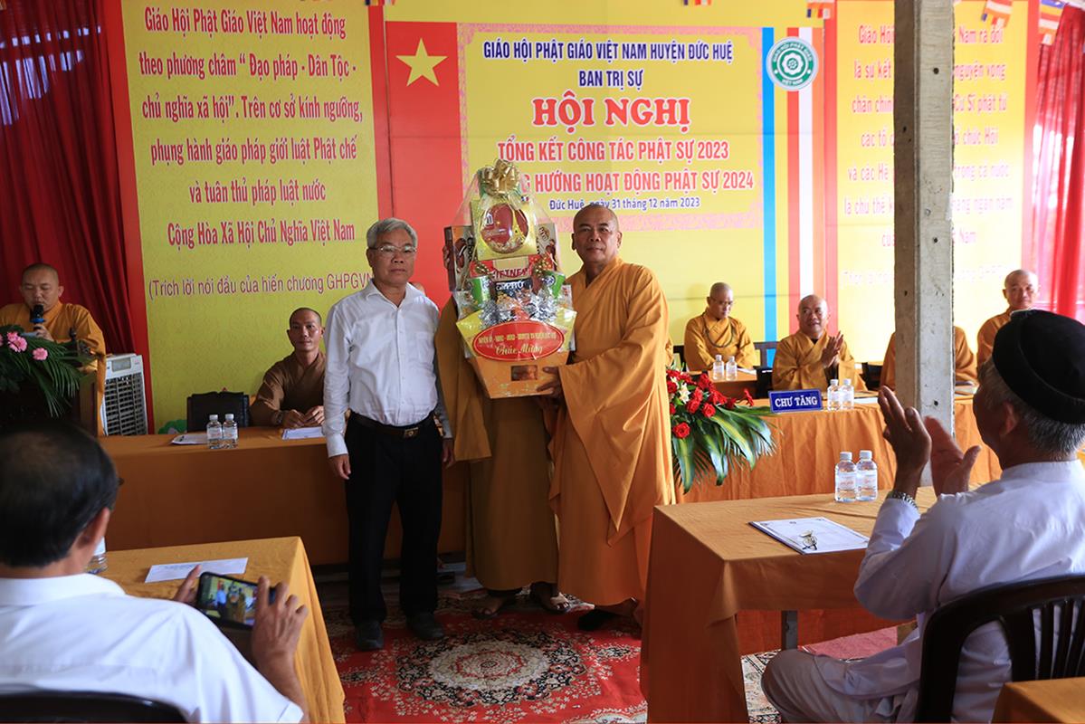 Thượng tọa ghi nhận những thành tựu mà Phật giáo huyện Đức Huệ đã đạt được trong năm qua và cần phát huy tốt hơn nữa trong năm 2024, nhất là công tác an sinh xã hội và phát triển các đạo tràng tu học.