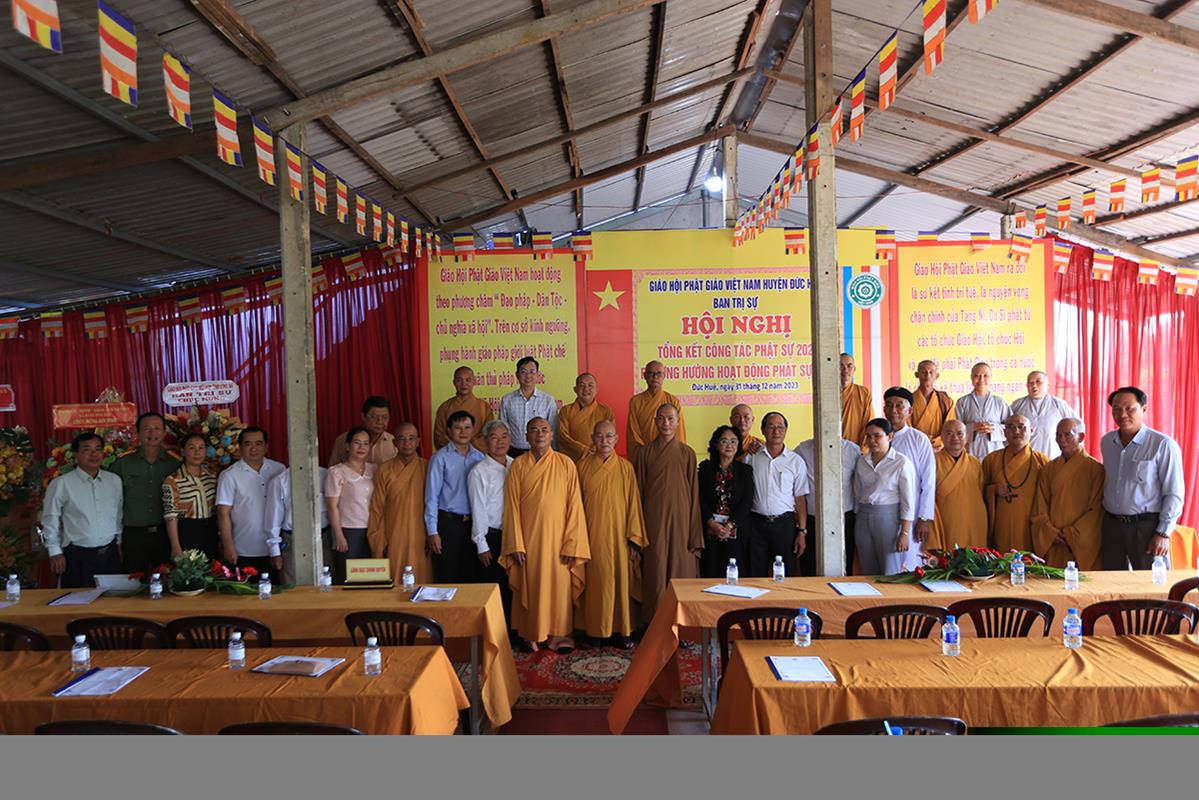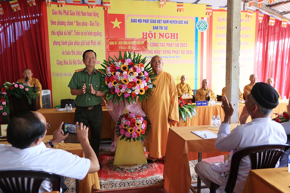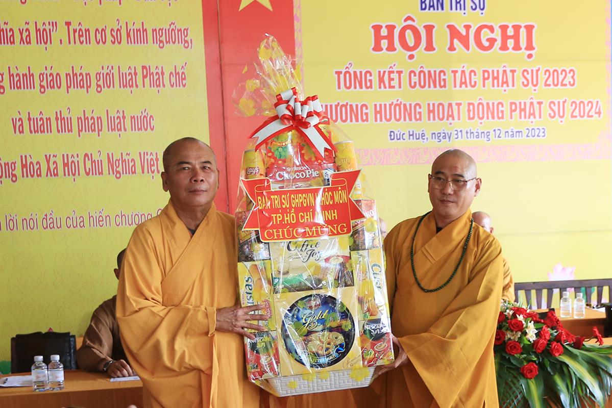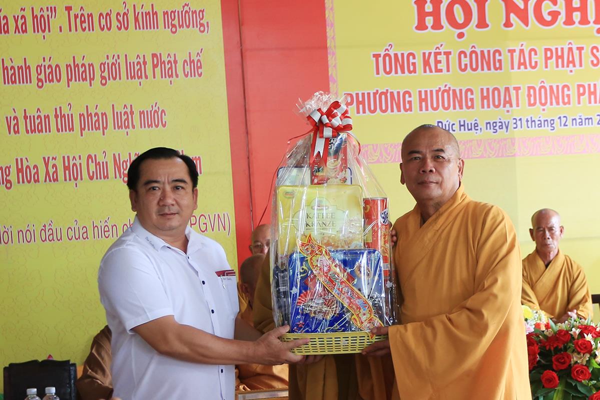 Thượng tọa ghi nhận những thành tựu mà Phật giáo huyện Đức Huệ đã đạt được trong năm qua và cần phát huy tốt hơn nữa trong năm 2024, nhất là công tác an sinh xã hội và phát triển các đạo tràng tu học.