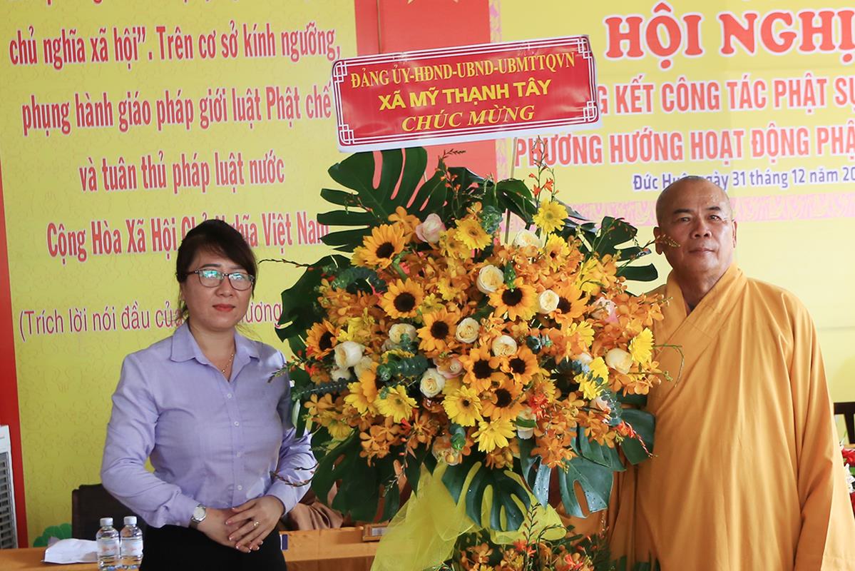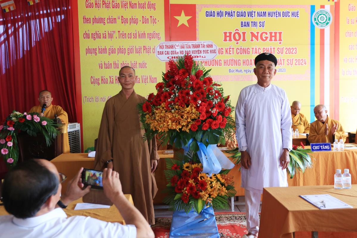 Hội nghị đón nhận nhiều phần quà, lãng hoa chúc mừng từ BTS GHPGVN tỉnh Long An, Huyện ủy – HĐND – UBND – UBMTTQVN huyện Đức Huệ, Đảng ủy – Ban Chỉ huy Quân sự huyện Đức Huệ, BTS GHPGVN huyện Hóc Môn, Ban Cai Quản Họ Đạo huyện Đức Huệ, Ngân hàng Agribank Đức Huệ.
