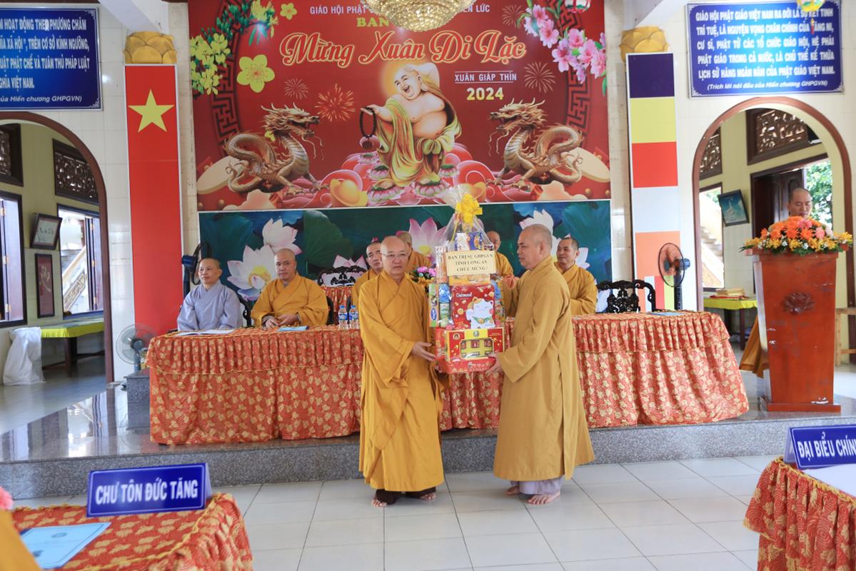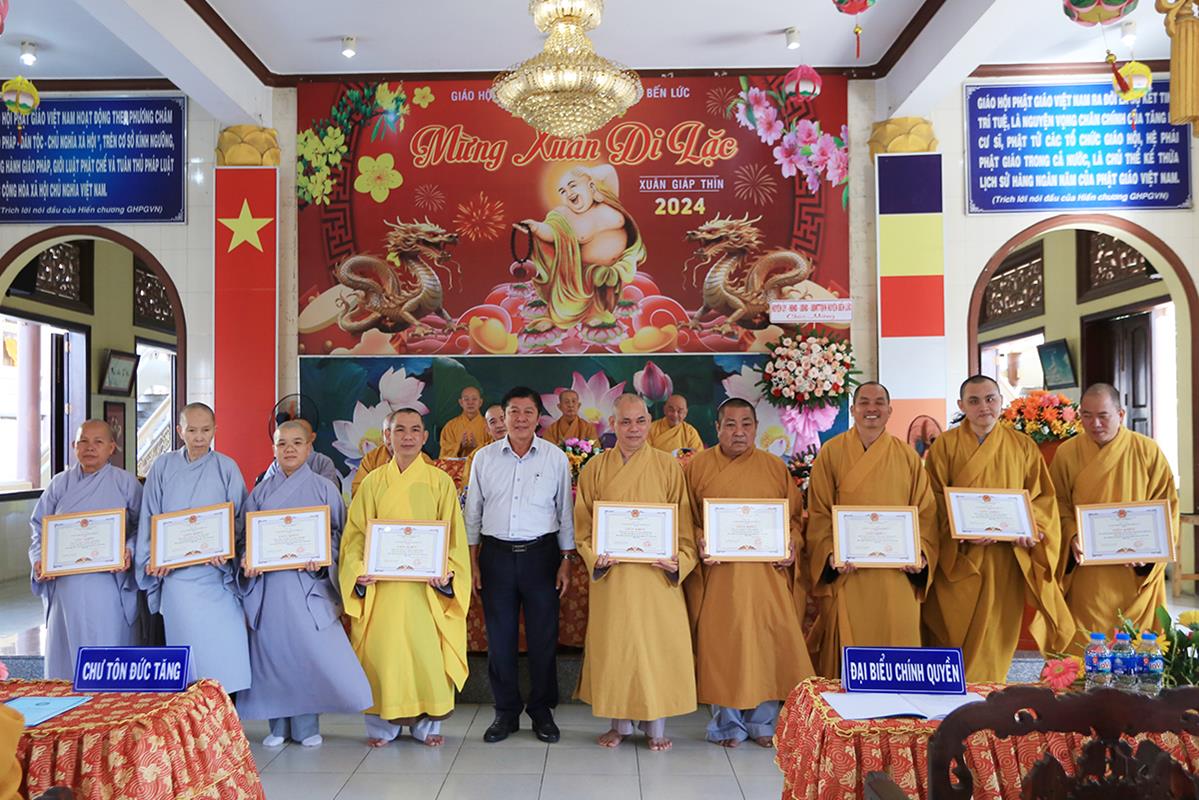 Dịp này, Ban Trị sự GHPGVN tỉnh Long An đã tặng bằng bằng công đức, UBND huyện Bến Lức đã trao giấy khen đến các tập thể và cá nhân tiêu biểu đã hoàn thành tốt công tác Phật sự năm 2023.