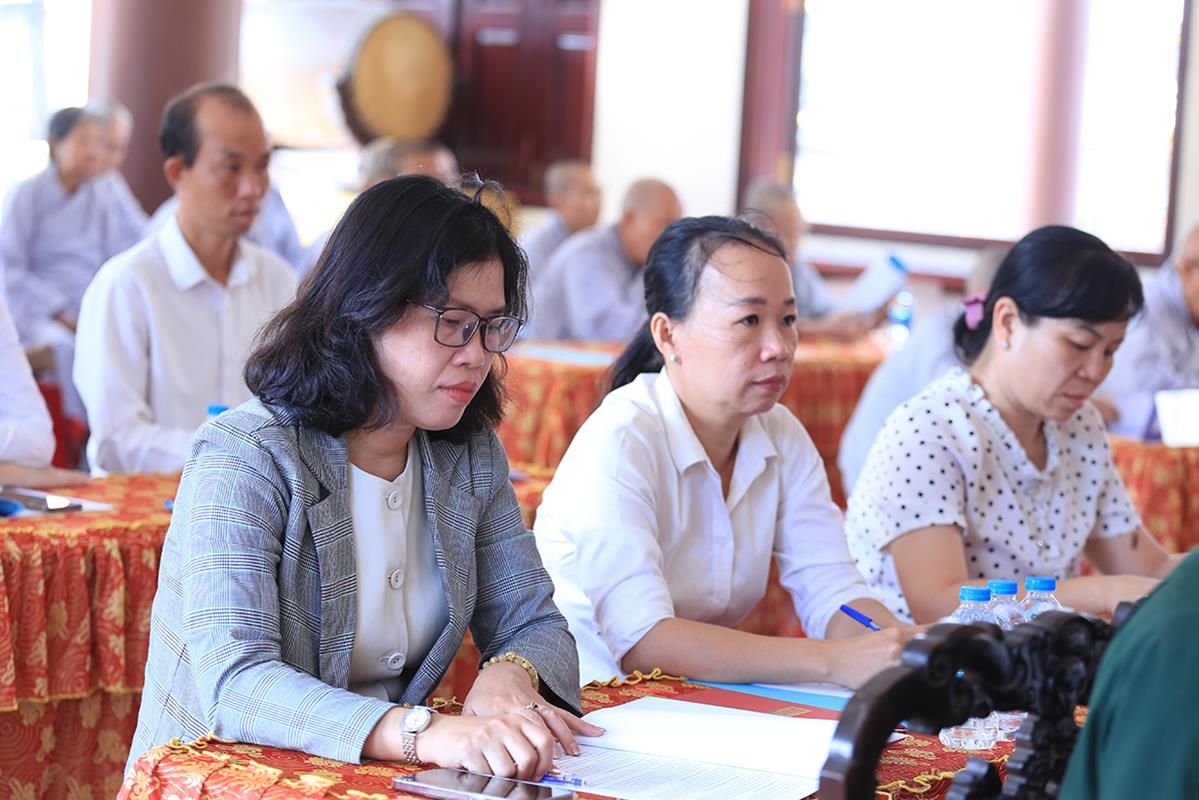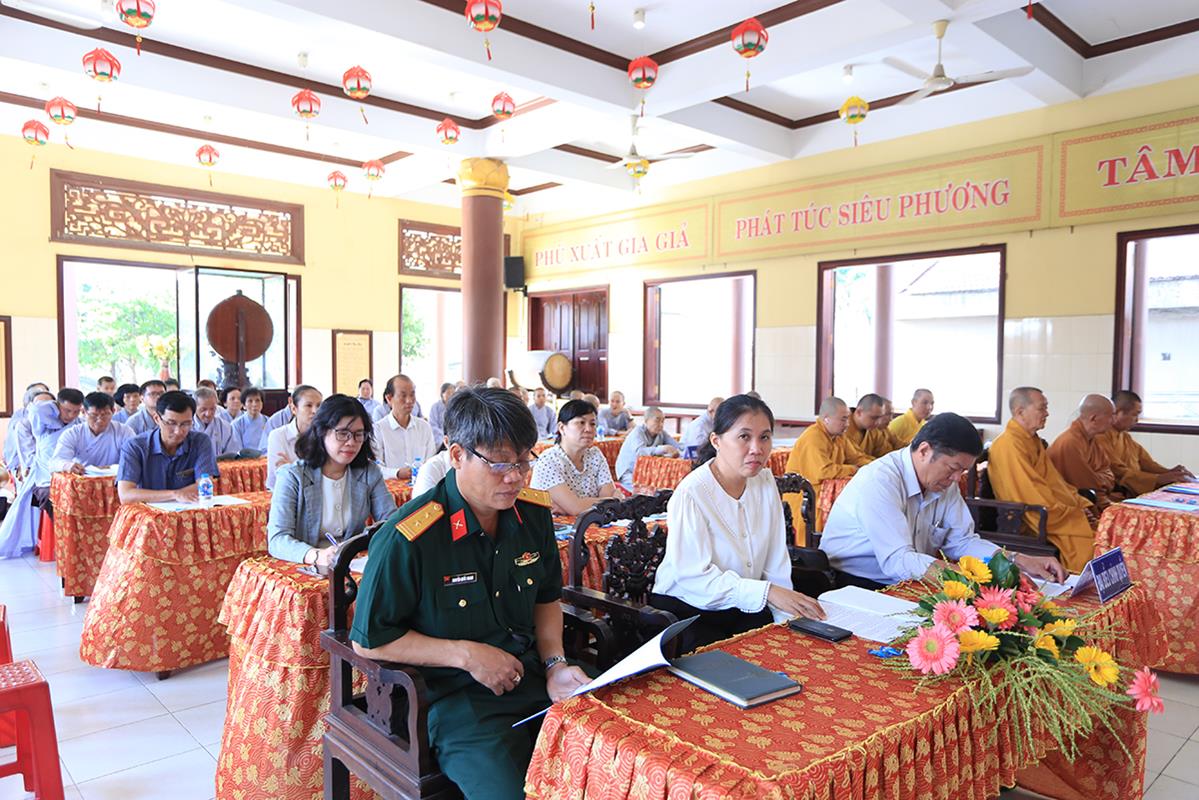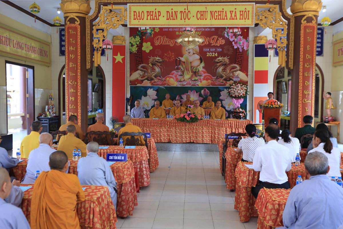 ĐĐ. Thích An Ngôn thông qua báo cáo tổng kết hoạt động Phật sự năm 2023 và dự kiến phương hướng hoạt động Phật sự năm 2024. Theo đó, Phật giáo huyện Bến Lức hiện nay gồm có 31 cơ sở: 30 cơ sở Tự Viện, 1 Điểm nhóm sinh hoạt tập trung Thọ Quang. Trong đó có 26 cơ sở thuộc Giáo Hội quản lý và 5 cơ sở đang xin gia nhập Giáo Hội với 56 Tăng ni đang tu học trên địa bàn huyện. Ban Trị Sự Giáo Hội Phật Giáo Việt Nam huyện Bến Lức đã đạt được những thành tựu nổi bật trong công tác Phật sự năm 2023, trong đó nổi bật là công tác từ thiện với tổng giá trị là: 3.744.405.000 đ (Ba tỷ bảy trăm bốn mươi bốn triệu bốn trăm lẻ năm ngàn đồng).