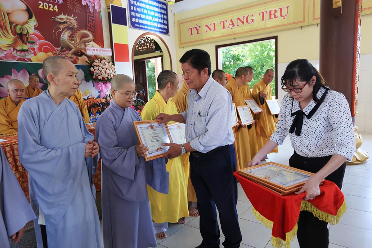 Dịp này, Ban Trị sự GHPGVN tỉnh Long An đã tặng bằng bằng công đức, UBND huyện Bến Lức đã trao giấy khen đến các tập thể và cá nhân tiêu biểu đã hoàn thành tốt công tác Phật sự năm 2023.