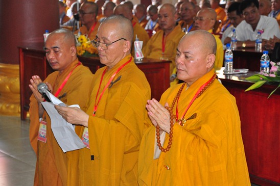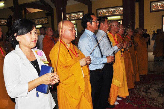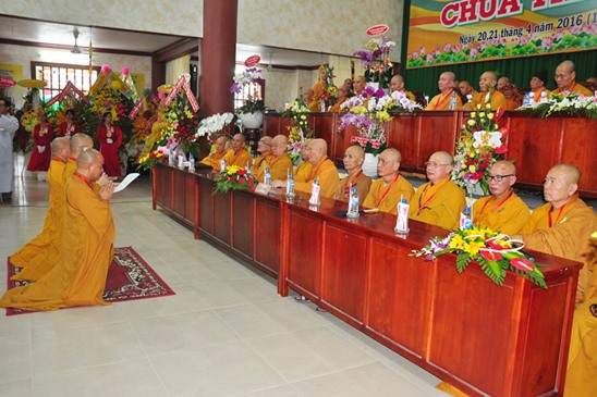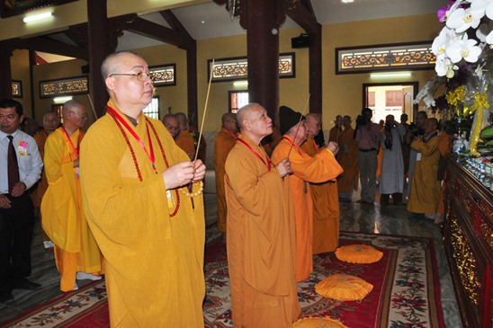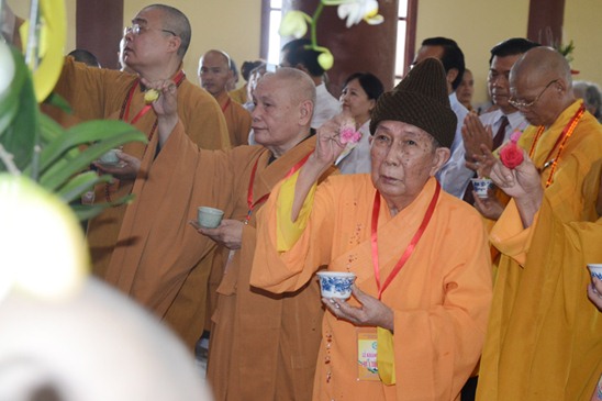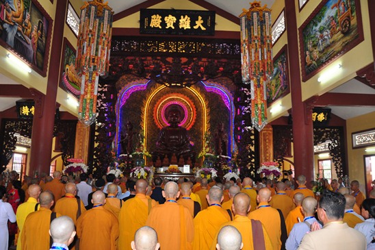 Đúng 8h, hợp thời hành lễ cung nghinh tác pháp Lạc Thành, Hòa thượng Thích Minh Thiện, Trưởng Ban Trị sự GHPGVN, tỉnh Long An, Trưởng Ban tổ chức Đại lễ, cung đối trước chư Tôn Giáo phẩm TW kính lời bạch thỉnh chứng minh.