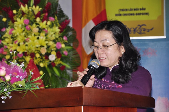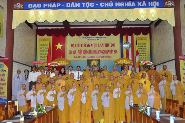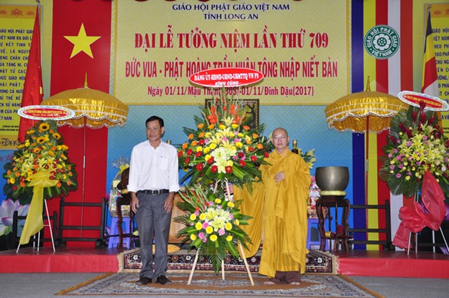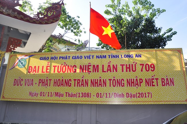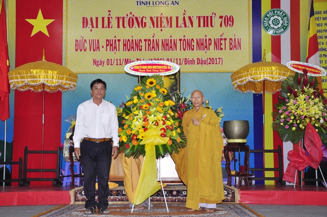 Thay mặt lãnh đạo tỉnh Long An Bà Phạm Ngọc Tiệp- Phó Chủ tịch MTTQVN tỉnh Long An đã phát biểu: “Đức vua Trần Nhân Tông là một trong những vị vua bậc nhất của Triều Trần, một nhà thơ một nhà văn hóa nổi tiếng, người sáng lập ra thiền phái Trúc lâm của phật giáo VN, hiện thân giữa sự kết hợp giữa Đạo và đời, để bảo vệ và xây dựng đất nước. Trong con người và sự nghiệp của đức vua Trần Nhân Tông “Đời và Đạo”, “Đạo và Đời” luôn hòa nguyện và gắn bó với nhau vì hạnh phúc của muôn dân, vì sự phát triển của đất nước. Với đời Ông là vị vua nhân từ, một nhà chiến lược tài ba, luôn nêu cao ngọn cờ Đại đoàn kết toàn dân tộc, hết lòng vì nước vì dân. Trong chiến đấu thì kiên cường mưu lược. Trong hòa bình thì dành hết tâm sức tìm kế sách khoan hòa trong nhân dân.