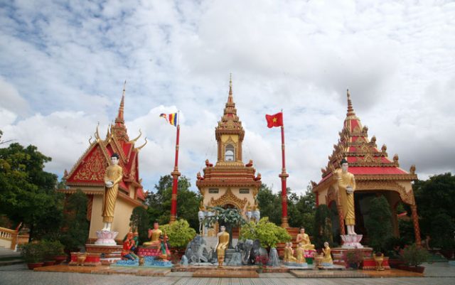 Đối diện với khu vực chính điện và mộ tháp là quần thể tháp – tượng, gồm 3 tháp chính cùng các pho tượng Phật ở các tư thế tọa thiền khác nhau. Một số tượng được dựng theo những điển tích của nhà Phật. Đây là không gian kết nối chính điện, khu mộ tháp và khu sala… Các công trình này đều có gam màu vàng chủ đạo kết hợp cùng hệ thống hoa văn nhiều màu sắc làm nổi bật phong cách kiến trúc Khmer truyền thống.