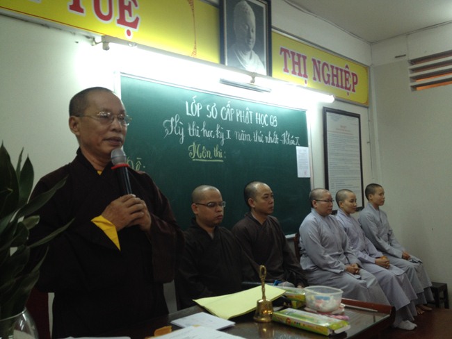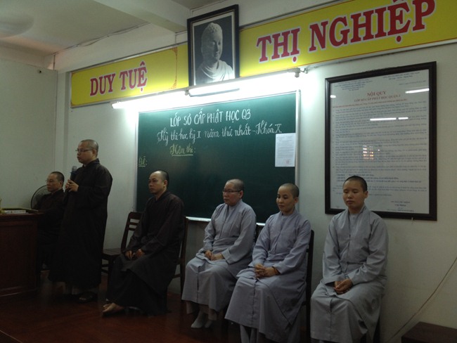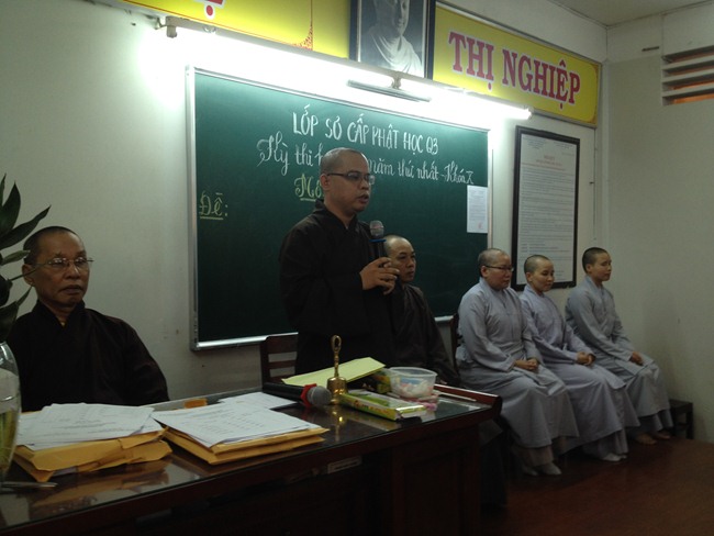 Kỳ thi đặt dưới sự chứng minh của Ban giám khảo; HT. Thích Thanh Vân – Phó Ban Thường trực BTS GHPGVN Q.3, Phó CN lớp sơ cấp, ĐĐ. Thích Thiện Châu – Chánh Thư Ký BTS PG Q.3 và chư tôn đức trong Ban giám thị.