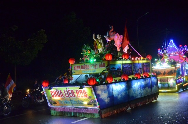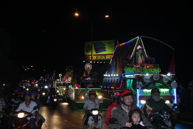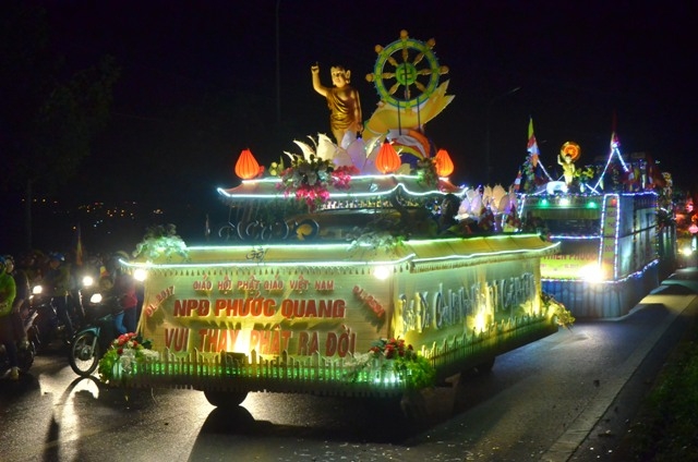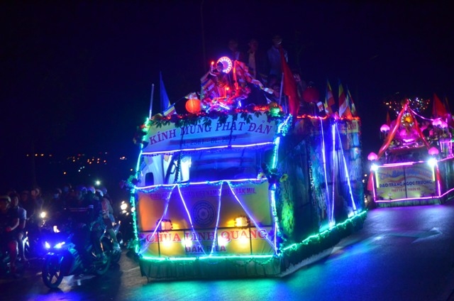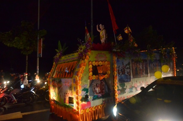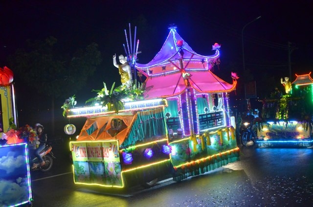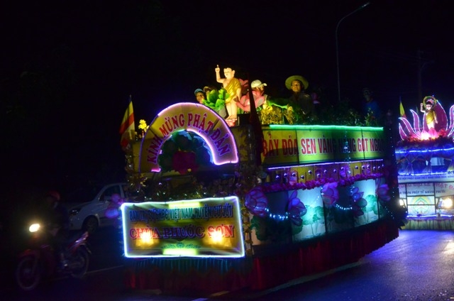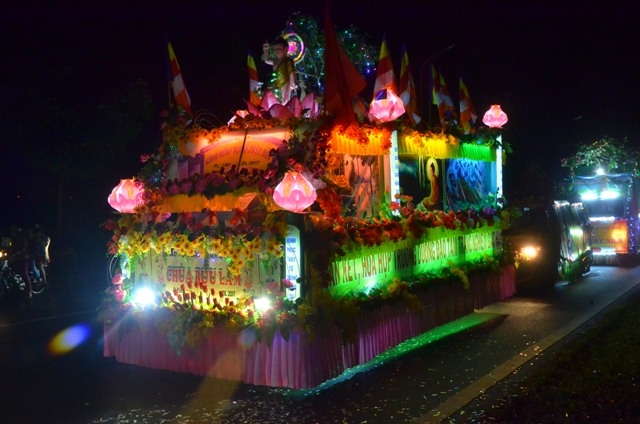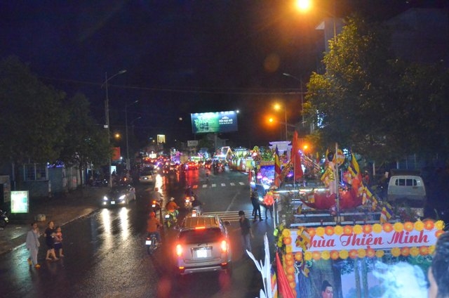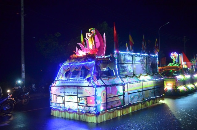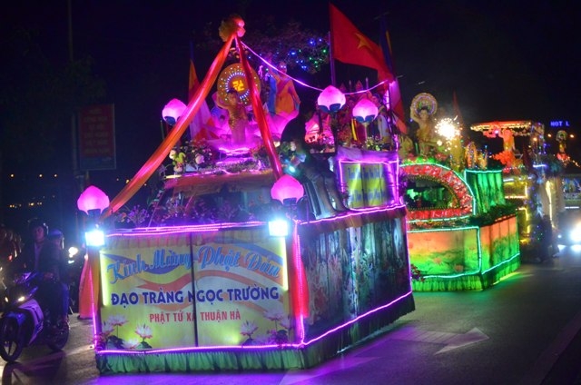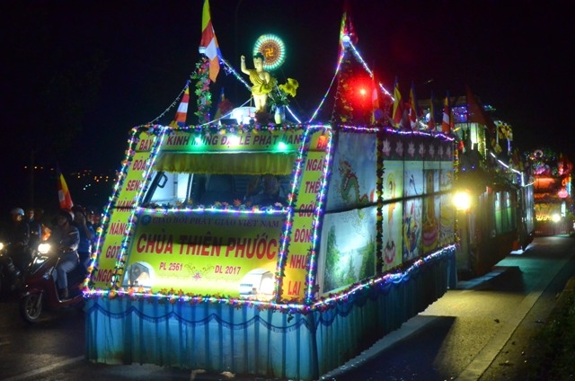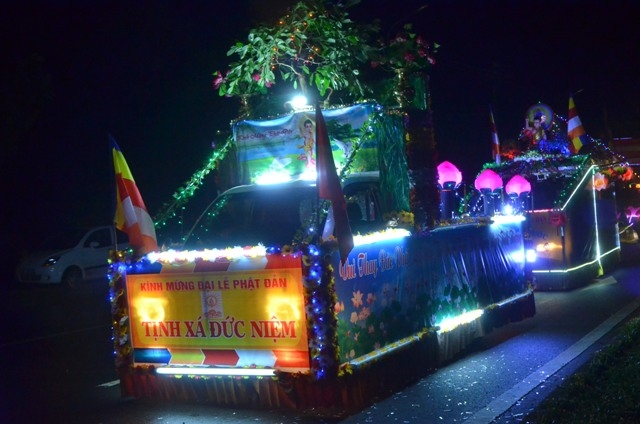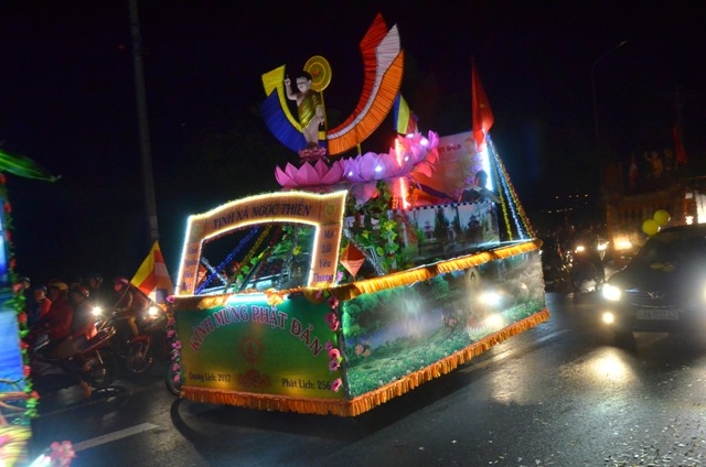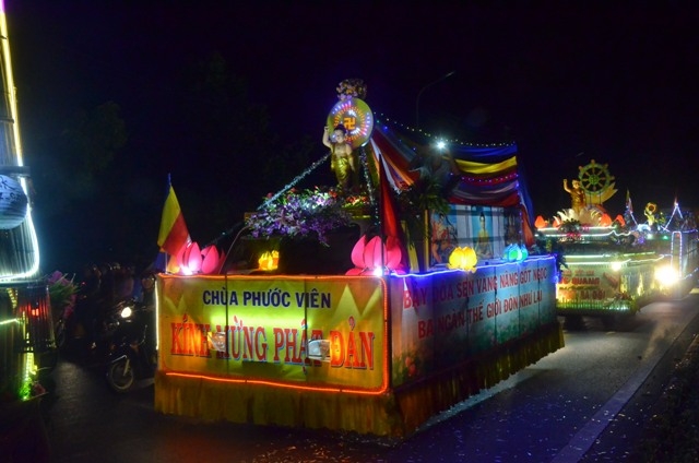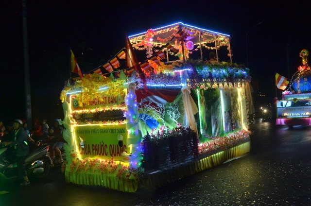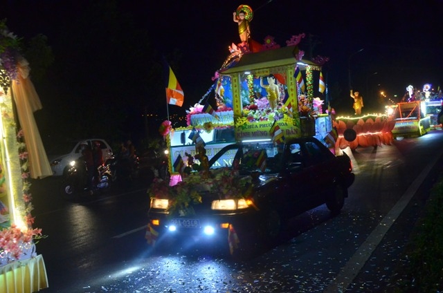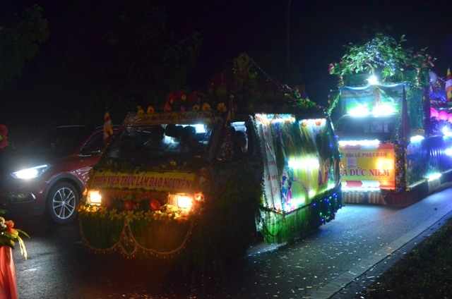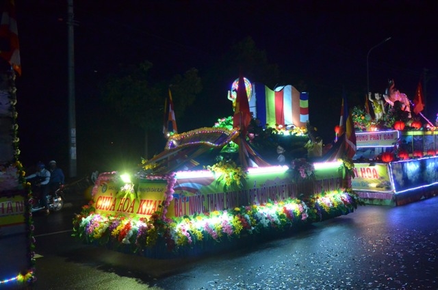 Từ trung tâm thị xã cho đến thông quê, Chư tôn đức Tăng Ni cùng quý Phật tử đã phát tâm dõng mãnh, cùng nhau thiết trí xe hoa, diễu hành về lễ đài chính Chùa Pháp Hoa. Đúng 7 giờ tối, đoàn xe hoa qua những con đường chính, ai ai cũng hoan hỷ, người người vẫy tay kính chào.
