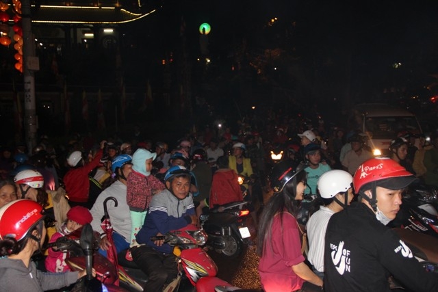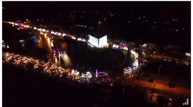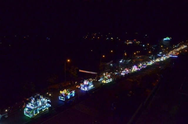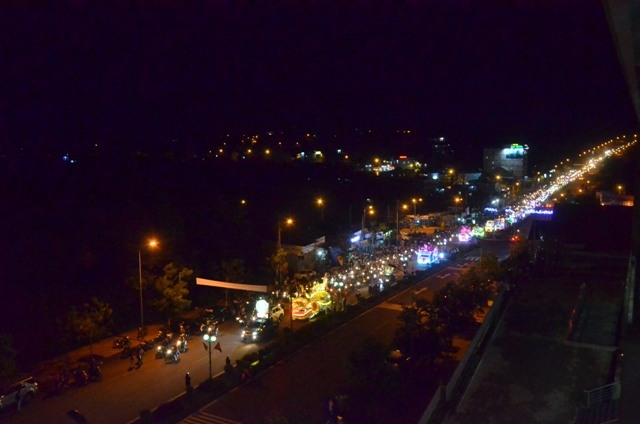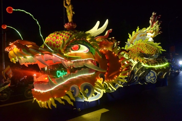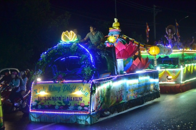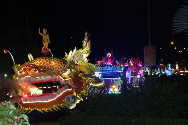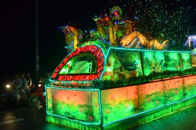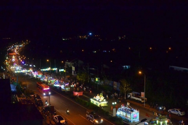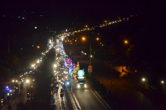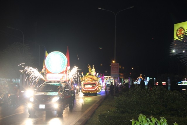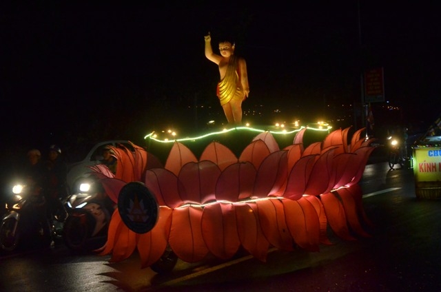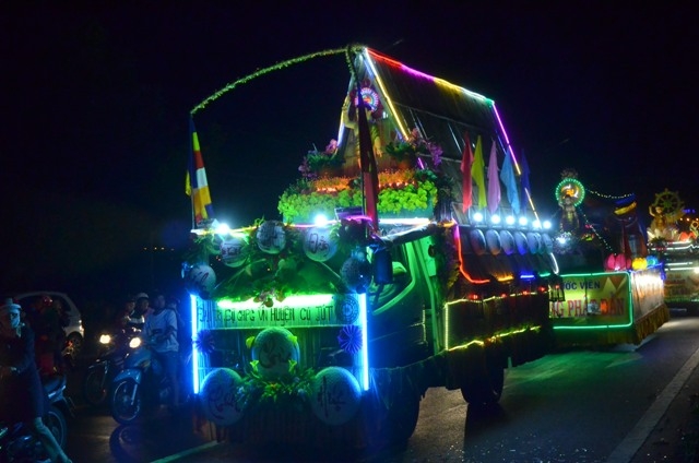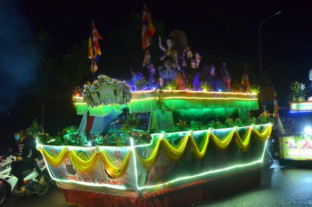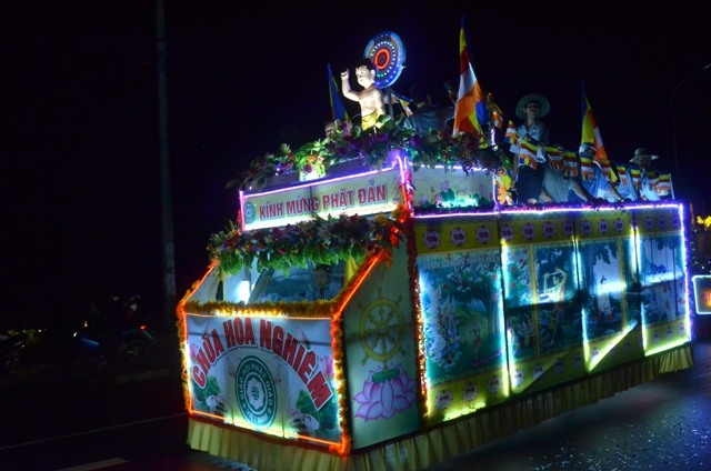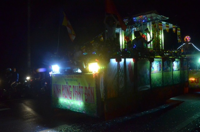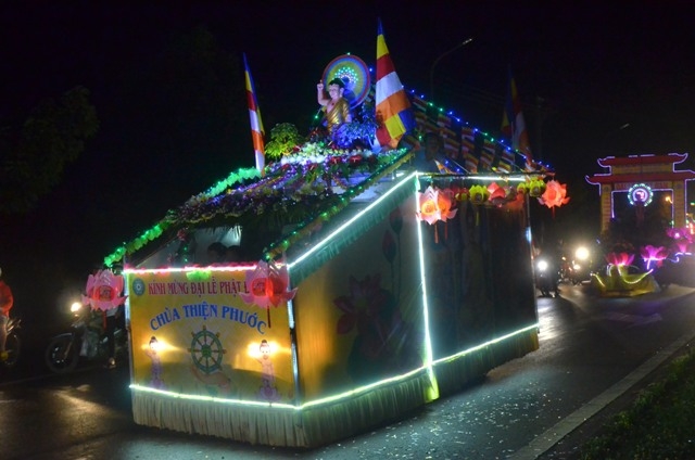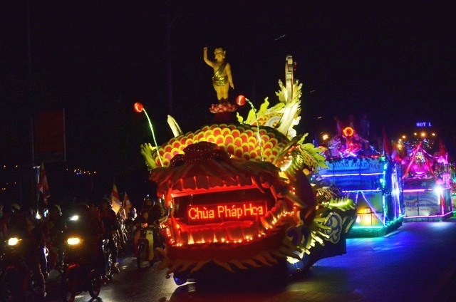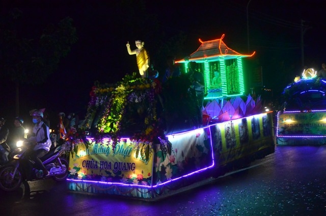 Từ trung tâm thị xã cho đến thông quê, Chư tôn đức Tăng Ni cùng quý Phật tử đã phát tâm dõng mãnh, cùng nhau thiết trí xe hoa, diễu hành về lễ đài chính Chùa Pháp Hoa. Đúng 7 giờ tối, đoàn xe hoa qua những con đường chính, ai ai cũng hoan hỷ, người người vẫy tay kính chào.