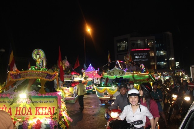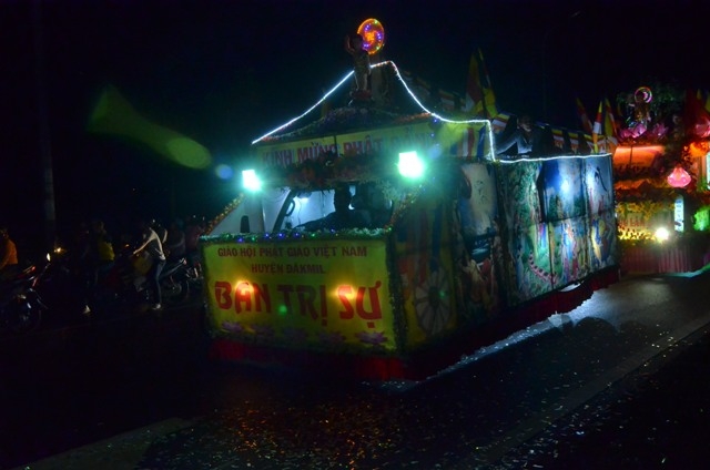 Đất trời tây nguyên mùa Phật đản năm nay mưa khá nhiều, mây đen khắp nơi kéo về. Nhưng thật lạ, khi diễn ra buỗi diễu hành xe hoa, trời bắt đầu ngừng mưa, ánh trăng ló dạng, như chứng minh và hoan hỷ cho công đức và tấm lòng của Chư Tôn đức Tăng Ni Phật tử tỉnh nhà. Thế là, với những sắc màu lung linh, xe rồng phun nước, cờ hoa rợp trời, hàng ngàn người con Phật cũng như dân chúng tại thị xã đã hòa chung nhịp đập, người người vui ca, chúc mừng ngày Đản sanh của Đức Phật Thích Ca Mâu Ni.