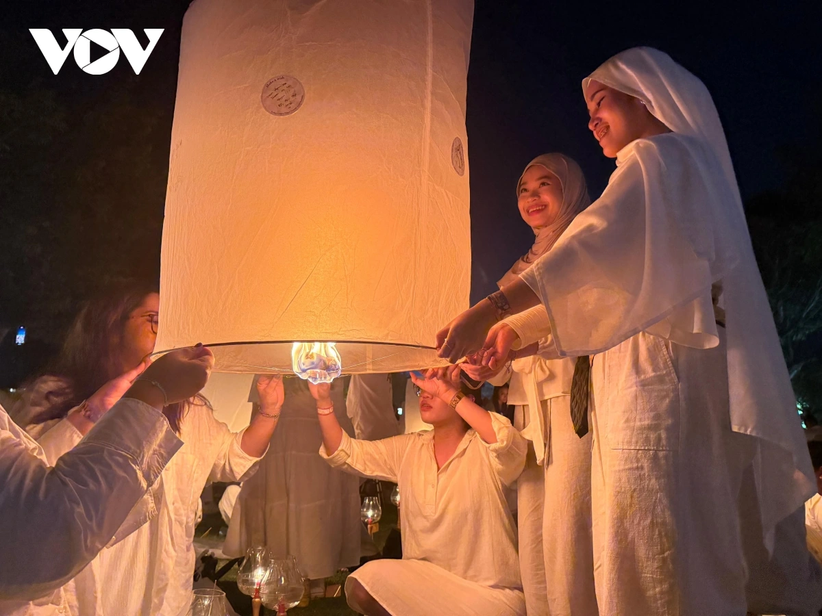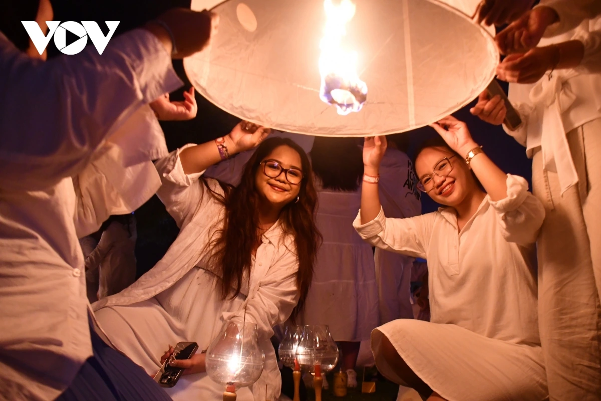 Những người tham dự mặc đồ trắng, ghi những hy vọng và lời cầu nguyện của họ lên những tấm thiệp ước nguyện gắn trên mỗi chiếc đèn lồng trước khi thả chúng lên bầu trời đêm.