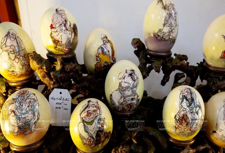 Từ những quả trứng đà điểu không đậu con, được mài bóng, nghệ sỹ Hoàng Thanh dùng bút sắc khắc họa tượng của Đức Phật, tượng của Đức Phật Quan Thế Âm Bồ tát, các chủ đề “Thập bát La hán đồ”, “Bát tiên” là những vị Bồ tát đã đạt được tam minh, lục thông và bát giải thoát. Những nét khắc tinh tế, không dùng màu, nhưng khi cho đèn vào các hình ảnh nổi lên sinh động. Từ câu nói của người xưa “ Khắc cốt ghi xương”, nghệ sỹ Hoàng Thanh đã khắc hình Địa Tạng vương Bồ Tát lên xương cá, lấy màu sáng trên xương làm ra được tác phẩm giống như thời cổ xưa đã làm.
