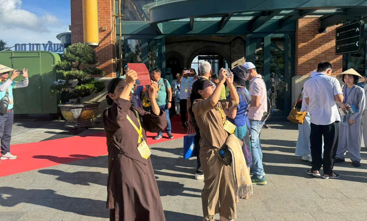 Đông đảo tăng, ni, Phật tử và du khách trong, ngoài nước đều tranh thủ chụp lại những hình ảnh ấn tượng về chùm mây ngũ sắc đôi.