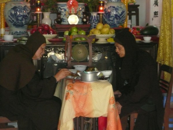 Đến thời Ngọ trai, gian giữa nhà Tổ chùa Ráng, dưới ban thờ, trên một chiếc bàn nhỏ chông chênh phủ tấm vải nhựa được đặt một mâm cỗ chay rất thịnh soạn, bê trĩu tay. Hai vị Tổ (88 và 96 tuổi) ngồi đối diện trên 2 chiếc ghế mộc nhỏ. Khẽ đụng, chiếc bàn rung rinh…