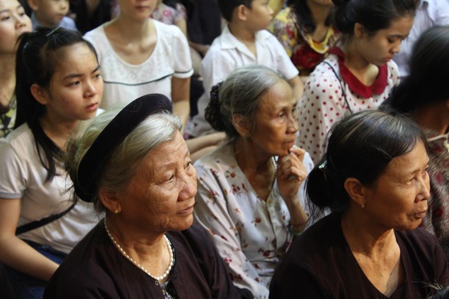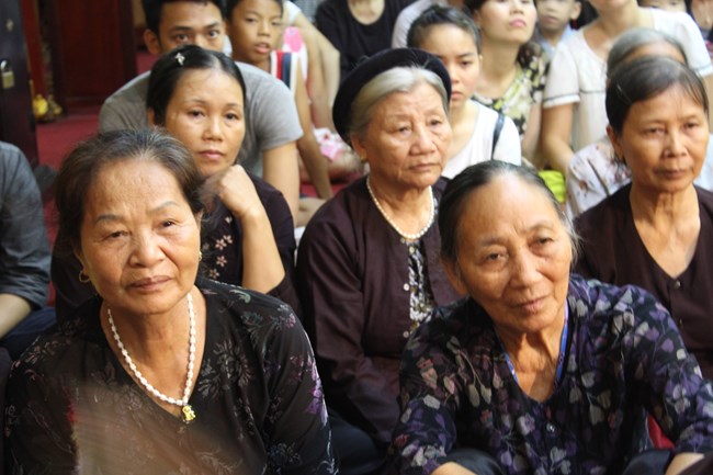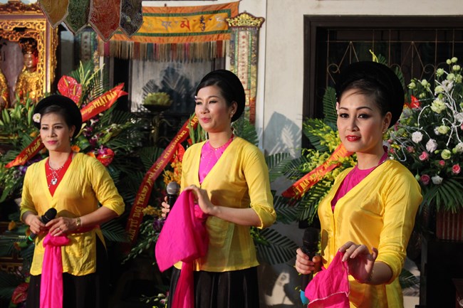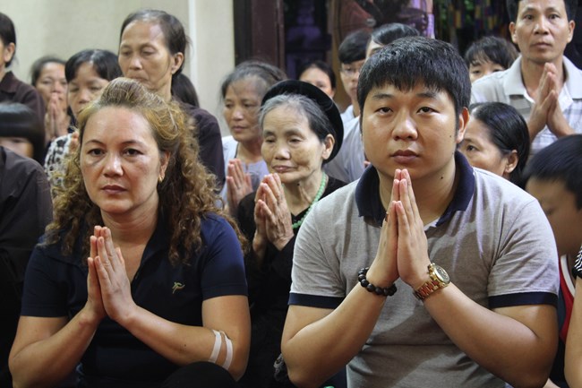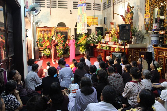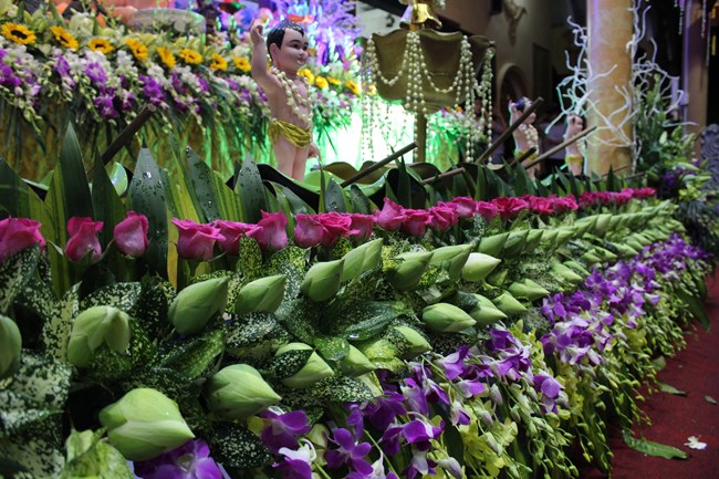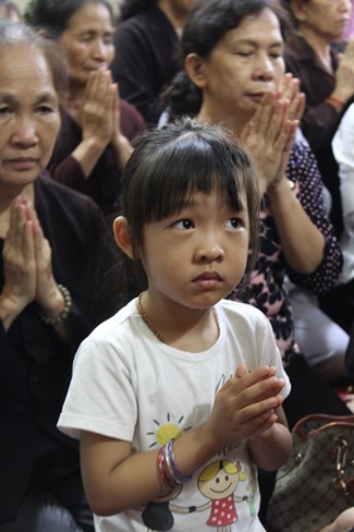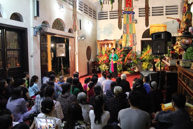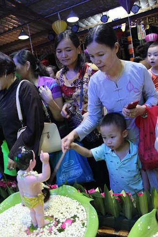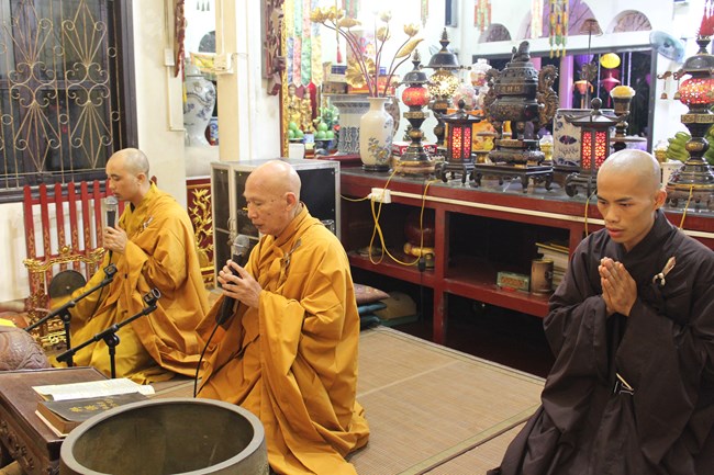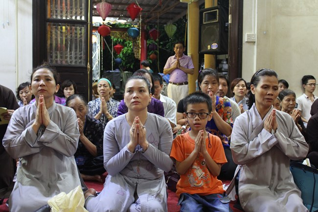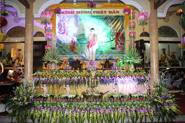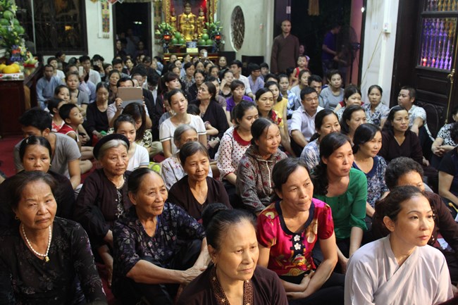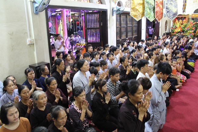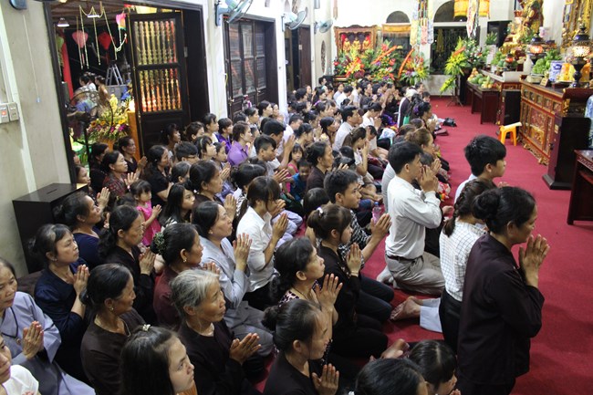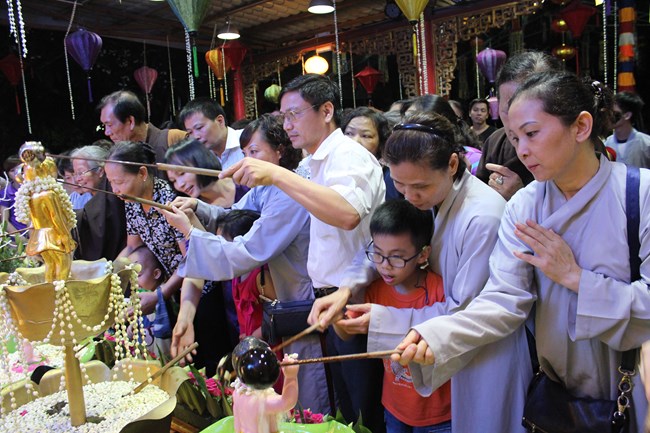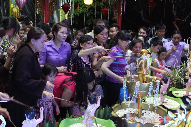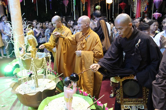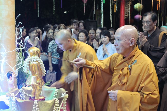 Sau đó, trong không gian trang nghiêm trước Đại Hùng Bảo Điện, dưới sự chủ lễ của Thượng tọa Thích Chiếu Tạng – Ủy viên HĐTS GHPGVN, Phó ban Hoằng pháp TW, Phó Trưởng ban trị sự Thành hội Phật giáo Hà Nội và chư tôn đức Tăng bản tự, toàn thể đại chúng đã chí thành chí kính chắp tay búp sen thực hiện nghi thức niêm hương, tụng kinh Phật Đản và làm lễ tắm Phật.