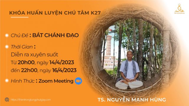 Từ ngày 14 đến 16 tháng 4 năm 2023 sẽ diễn ra khoá THIỀN ONLINE (còn được gọi là khoá Huấn Luyện Kỹ Năng Chú Tâm Liên Tục Online K27) do Tiến sỹ Nguyễn Mạnh Hùng trực tiếp hướng dẫn. Các thiền sinh vẫn ở tại nơi mình cư trú, chỉ cần bật Zoom lên, cùng nghe hướng dẫn và thực hành thiền, rèn luyện kỹ năng chú tâm liên tục trong suốt hơn 50 tiếng đồng hồ, từ tối thứ 6 và trọn vẹn 2 ngày cuối tuần, đến hết đêm chủ nhật.