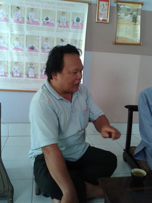 Tôi hỏi anh về lịch trình công phu hàng ngày anh nói rằng các buổi sáng anh tụng kinh Lăng nghiêm tối tụng kinh A Di Đà, hay phẩm Phổ môn hoặc 1 kinh khác. Riêng các ngày mồng một và rằm anh luôn lễ Phật sám hối. Anh cũng nói rằng khi tụng kinh anh chỉ đi chuông chứ không gõ mõ, tránh sự dị nghị của hàng xóm và người thân.